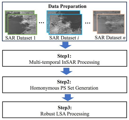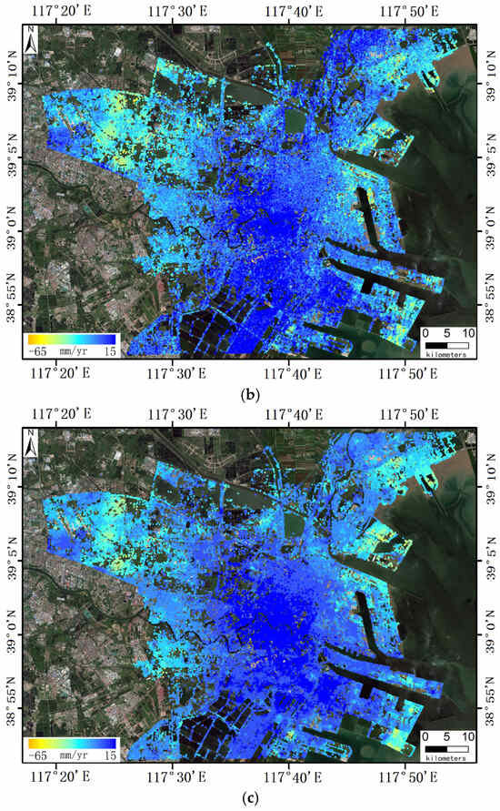 (3) The proposed workflow was rigorously validated using the Radarsat-2 and Sentinel-1 datasets within the complex and rapidly evolving Tianjin Binhai New Area. The experimental outcomes substantiate the efficacy of the methodology. Specifically, the robust LSA approach successfully identified and eliminated 11.1% of homonymous PS sets affected by gross errors. More notably, the displacement estimates derived from robust LSA and traditional OLS achieved a high level of accuracy, with an annual displacement rate of 5.7 mm/yr when compared to leveling validation data. Furthermore, a localized analysis incorporating both leveling validation and time series comparison was conducted in the Airport Economic Zone, and a conclusion that the accuracy of the proposed method was enhanced by 42.5% relative to the traditional OLS approach is acquired. Reliability assessment further corroborates that the integration of multiple InSAR datasets significantly improves both internal and external reliability metrics in comparison to single-source analyses.