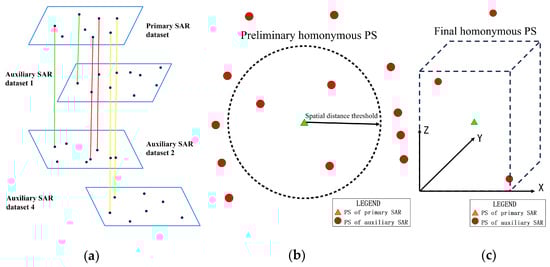 (a) Selection of primary SAR and auxiliary datasets; (b) identification of preliminary homonymous PS set incorporating spatial positional information; (c) selection of final homonymous PS set integrated with elevation data.