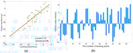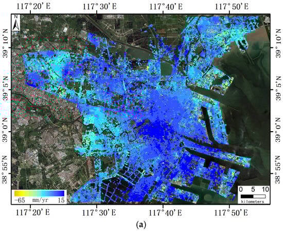Drawing upon the established relationships between InSAR measurement accuracy, coherence coefficient, and the effective number of interferograms, and taking into account the distribution of SAR interferometric pairs pertinent to this study, the mean square error of the settlement rate is determined to be 1 mm/yr [,].