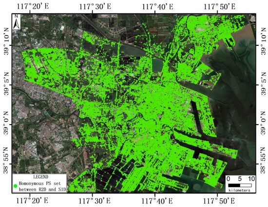 In the context of multi-sensor InSAR data fusion, homonymous PS set refer to ground targets that exhibit temporally stable radar scattering characteristics across multiple SAR acquisitions. The precise identification of such sets is essential for robust LSA analysis and must comply with two fundamental constraints. (i) Spatial constraint. Homonymous PS set is required to meet a Euclidean distance threshold based on Tobler’s First Law of Geography, which asserts that geographically proximate locations tend to possess similar characteristics. (ii) Redundant observation constraint. Each PS must be observed independently in at least two overlapping SAR image datasets []. This redundancy is critical for facilitating robust LSA analysis through statistical cross-validation.