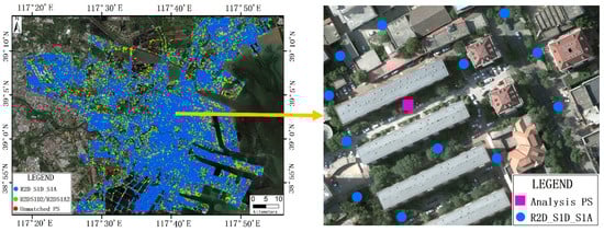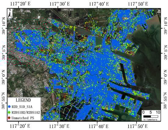 where indicates the number of homonymous PS sets. represents the number of redundancy components associated with the -th homonymous PS set. Utilizing Equation (6) for the homonymous PS sets categorized as “R2D_S1D_S1A” in Figure 9, the computed redundancy value of is 0.67. For the homonymous PS sets classified as “R2DS1D2/R2DS1A2”, the redundancy value of is recorded at 0.5. In contrast, for the homonymous PS sets designated as “unmatched”, the redundant value amounted to 0.
