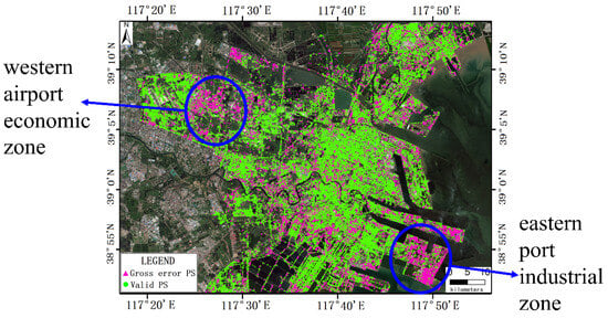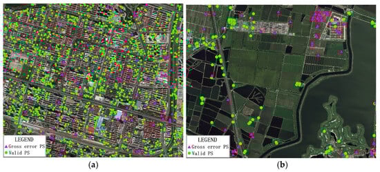 Spatial distribution of PS sets with gross errors and valid PS sets in urban and suburban areas, (a) urban region, (b) suburban region.