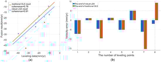 Existing InSAR fusion frameworks predominantly rely on traditional Ordinary Least Squares (OLS) methods, which often fail to adequately address the issue of gross errors in the case of small SAR datasets. However, these gross errors frequently stem from phase unwrapping failures, maybe lead to significant distortions in displacement rates and subsequent misinterpretations of the underlying geophysical processes [,]. Notably, there is a scarcity of effective robust Least Squares Adjustment (LSA) methods specifically tailored for InSAR data fusion. This critical gap poses considerable challenges to the operational effectiveness of InSAR technologies, particularly in safety-critical applications such as the precise monitoring and prevention of regional ground displacement [,]. Therefore, further research and development of robust LSA frameworks are essential to enhance the reliability and accuracy of InSAR-derived measurements.