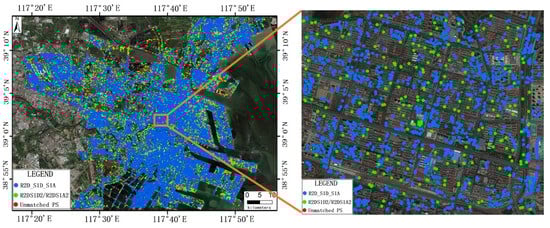 Spatial distribution of suburban region for reliability parameters analysis and the corresponding alignment of homonymous PS sets across the three InSAR datasets.