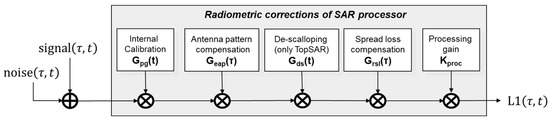 The SAR processor performs range and azimuth compression of the acquired raw data [13] and implements a set of corrections aimed at compensating for the data distortions introduced by the instrument (e.g., the antenna patterns) and by the acquisition geometry (e.g., the spread losses). Figure 4 represents a flow chart of the radiometric corrections applied by the S-1 IPF during L1 product generation. Please note that the implemented radiometric corrections affect both signal and noise.