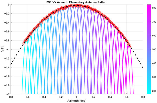 Figure 8 represents the azimuth elementary antenna pattern for IW1 VV (they are quite similar for all TopSAR beams). TopSAR IW1 azimuth steering is obtained by implementing 648 patterns. The cold-colored patterns represented in the image are a subset (1 out of 20) of all the 648 azimuth antenna patterns (the corresponding pattern index is reported in the color bar) as predicted by the S-1 AM. On the other hand, the red dots represent the peak of each azimuth pattern in gain and angular position. Finally, the black dashed line represents the antenna pattern model that is used to compensate the S-1 products, showing very good agreement with the peak’s envelope.