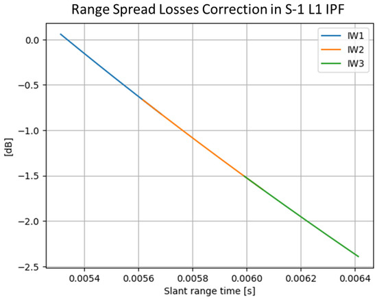 where is the slant-range axis of the product, is the speed of light and is a configurable reference distance set to 800 km for all S-1 products. Figure 9 represents an example of the spread losses correction applied by the processor for an IW product. The variation is around 2 dB.