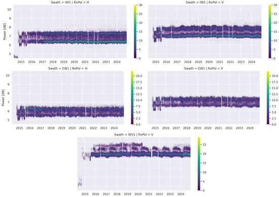- Schmidt, K.; Schwerdt, M.; Hajduch, G.; Vincent, P.; Recchia, A.; Pinheiro, M. Radiometric Re-Compensation of Sentinel-1 SAR Data Products for Artificial Biases due to Antenna Pattern Changes. Remote Sens. 2023, 15, 1377. [Google Scholar] [CrossRef]