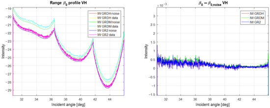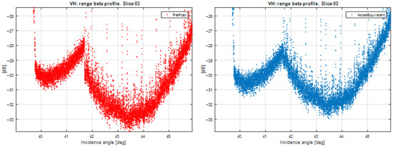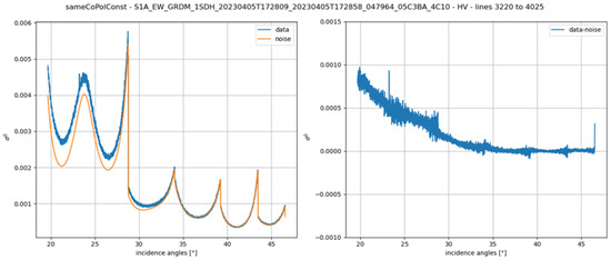 (Left) Data levels (blue) and noise vectors (orange) for a GRD product processed with IPF 3.7.0 with optimized calibration constants. (Right) De-noised data.