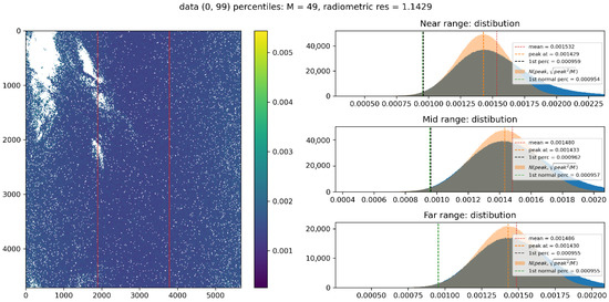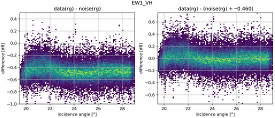 To avoid radiometric biases for very low SNR areas, the best approach is keeping negative pixels after the de-noising and measuring the radiometric level of the data including the negative values. This way, the measured radiometric level will be unbiased. In case of data portions showing a negative level after de-noising, which could happen in the case of calibrating non-perfect noise vectors, such blocks should be discarded by the analysis since are very close to the noise floor level. More sophisticated methods to obtain an unbiased signal level after data de-noising have also been proposed in the literature [22,23,24,25].