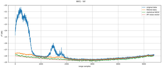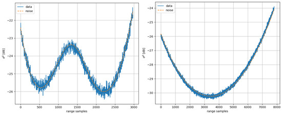 Comparison of noise vector (orange) and data (blue) on selected examples for S1A EW1 VH (left) and S1A IW3 HV (right) GRD bursts with low in–out-band power ratio.