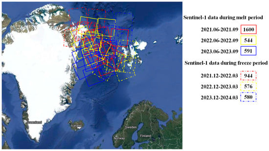 The study area and details of the SAR data collection used for this research are provided. Solid rectangles represent Sentinel-1 data spanning the melt period, while dashed rectangles indicate Sentinel-1 data collected during winter.