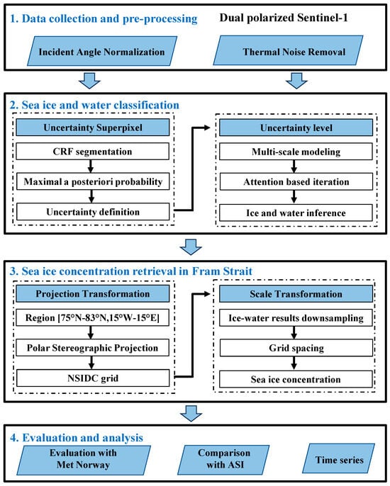 The first step of the flowchart is data collection and preprocessing is described in Section 3.2. The second step, ice–water classification, is the core methodology detailed in Section 3.3, Section 3.4 and Section 3.5. Sequential processing includes CRF and U-Net models. CRF models are used to obtain preliminary ice–water classification results at the superpixel scale and to calculate posterior probabilities to identify uncertain superpixels. The uncertainty level is ranked by comparing these results with the ice–water classification from U-Net. The third step involves retrieving SIC on NSIDC grids based on the obtained ice–water classification results, which are projected onto a polar stereographic projection NSIDC grid with a grid spacing of 1 km. The final step is evaluating the ice–water classification results and SIC products, and evaluation metrics are given in Section 3.6.