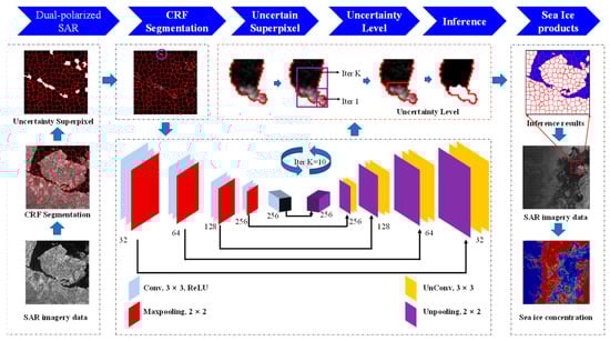 Some studies have incorporated uncertainty estimation in neural networks for SAR-based ice-water detection. However, these approaches often focus on model parameter uncertainty or utilize uncertainty to refine a single network’s output. The limitation is that they do not explicitly define and quantify classification uncertainty at the superpixel level stemming from ambiguous backscattering characteristics (e.g., thin ice vs. wind-roughened water). In this paper, we adopt the SAR data to develop SIC products to reduce the uncertainty from weather effects. The superpixel strategy in the proposed framework for ice–water classification is designed to efficiently reduce the uncertainty from the diverse scales of floes, wind roughening of open-water regions, and complicated surface features. To mitigate uncertainty arising from the varied backscattering coefficients, we employ the CRF algorithm to calculate the posterior probability and determine the level of uncertainty for each superpixel. Next, the higher uncertainty in ice–water classification will be refined using prior information from labels until it diminishes to a minimum. Ultimately, precise SIC is derived considering the uncertainty from various scales, diverse appearances, and training samples of sea ice. The main contributions of this study are as follows.