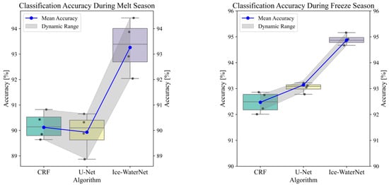 To compare the performance of different algorithms across seasons, the proposed Ice-WaterNet algorithm and SOTA methods were applied to datasets from both the melt and freeze seasons. Overall Accuracy (OA) was used to evaluate performance, as shown in Figure 4. Ice-WaterNet achieved the highest OA during both the melt and winter seasons. Among the algorithms, the CRF method performed best during the melt season, while U-Net performed the worst. This discrepancy can be attributed to the ambiguity caused by wet snow or melt ponds, which significantly reduce SAR backscatter coefficients. In the marginal sea ice zone (MIZ), the effects of winds and ocean currents on SAR backscatter can create further ambiguities between ice and water. Conversely, under calm conditions, the contrast between thin ice and flat open water diminishes, reducing the separability of level ice. The melt season poses the greatest challenge for reliable ice–water classification. However, Ice-WaterNet robustly outperformed the other methods during the winter season in terms of OA. Overall, the proposed Ice-WaterNet algorithm demonstrated superior performance over the two SOTA methods, regardless of the season.
