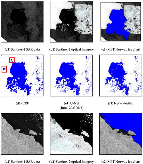 SAR scenes obtained during the melt and freeze-up periods are particularly challenging for sea ice mapping due to factors such as melt ponds, thin ice, and wind-roughened water. To provide a more intuitive comparison of our Ice-WaterNet algorithm with SOTA methods, we visualized the extraction results of all methods and compared them with optical imagery and the MET Norway Ice charts. The visualization of the experimental results in Figure 5 demonstrates that the proposed algorithm effectively reduces or eliminates inconsistencies at the open water boundary. When combined with optical Sentinel-2 imagery and MET Norway Ice charts, our algorithm, along with CRF and U-Net, delivers fine water boundaries from the ice–water classification results. For instance, in the June example scene (Figure 5(e1)), the CRF method misclassified ice as open water due to the low intensity of level ice in the upper left region. The U-Net method performed slightly better than the CRF method. However, from a visual assessment perspective, the proposed algorithm provides the most detailed ice–water classification results. As illustrated in the July example scene (Figure 5(f2)), CRF and U-Net were unable to detect the presence of icebergs, while Ice-WaterNet performed slightly better. In the August example scene (Figure 5(f3)), our Ice-WaterNet accurately extracted small ponds appearing on the ice surface during the melt season, closely matching the optical imagery. Although all comparison methods missed the small icebergs highlighted in the red circle, our Ice-WaterNet demonstrated its superiority. Overall, all methods effectively delineate the ice-water boundary, particularly the proposed algorithm, which successfully mitigates the backscattering coefficient variations caused by wind and ocean currents.