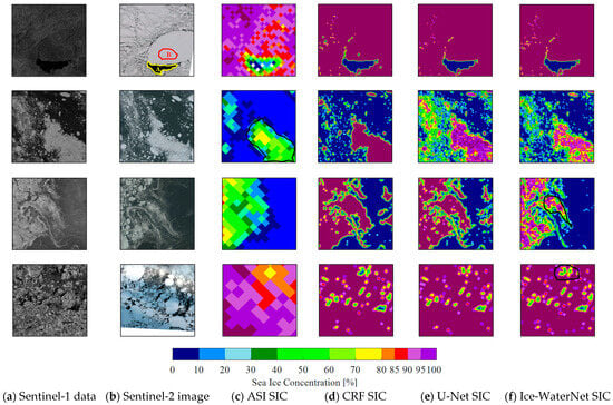 In addition, the average processing time for a single Sentinel-1 scene (approximately 10,000 × 10,000 pixels) was around 12 min on a standard GPU (NVIDIA RTX 3090), which is feasible for operational use given the bi-daily update cycle of SIC products. For comparison, standalone U-Net required ~10 min, while CRF alone took ~7.5 min per scene. Although Ice-WaterNet incurs additional time due to uncertainty refinement, the analysis presented in Figure 1 demonstrates that generating daily sea ice concentration products takes less than two hours. This timeframe remains acceptable for operational monitoring requirements, while the model’s superior accuracy justifies the trade-off.