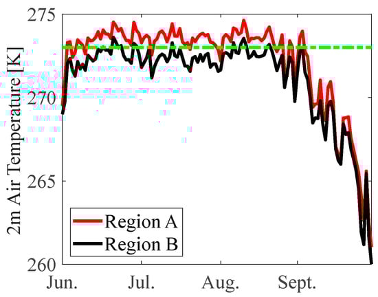 The 2 m air temperature from ERA5 for Region A and Region B, where Region A represents open water and Region B represents sea ice. The ERA5 reanalysis datasets were downloaded from the Copernicus data portal at: https://cds.climate.copernicus.eu/#!/home (accessed on 13 October 2025), the green line it the frozen line with the temperature of 273 K.