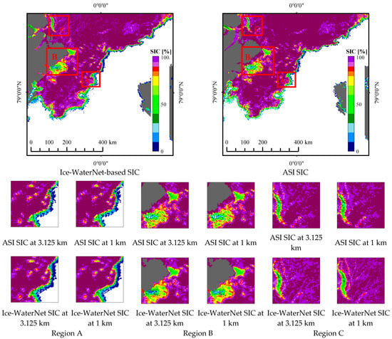 Different sea ice concentration (SIC) products for 30 September 2023 from the ASI and our proposed algorithm in the Fram Strait are visually compared in Figure 8. The SIC results of the two algorithms generally coincide, with the main deviations occurring in the sea ice marginal regions and leads. Our proposed algorithm appears more detailed and provides clearer boundaries between ice and water. Overall, the Ice-WaterNet concentration exhibits richer texture features compared to the ASI sea ice concentration, offering more detailed characteristics. For Region A, located in the sea ice marginal area, Ice-WaterNet identifies more sea ice details and provides a clearer ice edge line. In Region B, situated in a polynya area, Ice-WaterNet and ASI results are similar for high-concentration areas outside the polynya. However, within the low-concentration areas of the polynya, Ice-WaterNet provides more refined details. In Region C, corresponding to a lead area, Ice-WaterNet demonstrates clearer edge lines and more pronounced linear features around the leads.