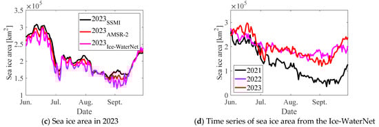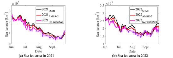 Figure 9 shows the sea ice area calculated using SIC from 2021 to 2023 in the Fram Strait, Arctic. The interannual variation in sea ice area is consistent, except during the early melting period (early June) and the early freezing period (late September). During these times, the sea ice area follows the pattern of SSM/I > AMSR-2 > Sentinel-1. This pattern is very clear in 2021, shows more fluctuations in 2022, and in 2023, the differences among the three data sources are relatively small. Overall, the trend indicates that passive microwave retrievals tend to overestimate sea ice area, while high-resolution SAR-based active microwave algorithms provide more accurate SIC products. These SAR-based results reflect sea ice changes more precisely, suggesting that the extent of sea ice melt is more severe than previously estimated.