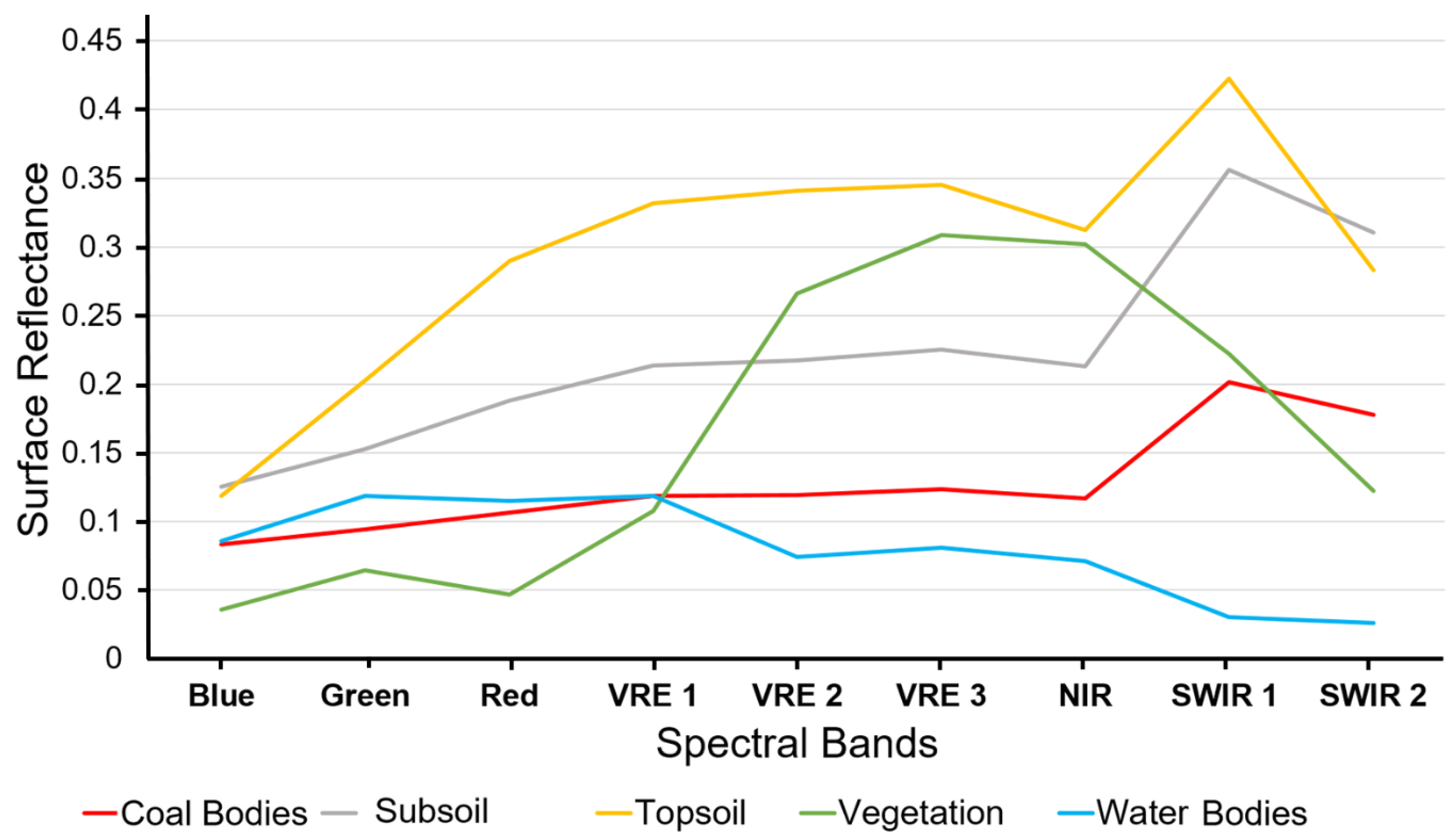 Spectral reflectance comparison of coal mining surface change and reclamation process.