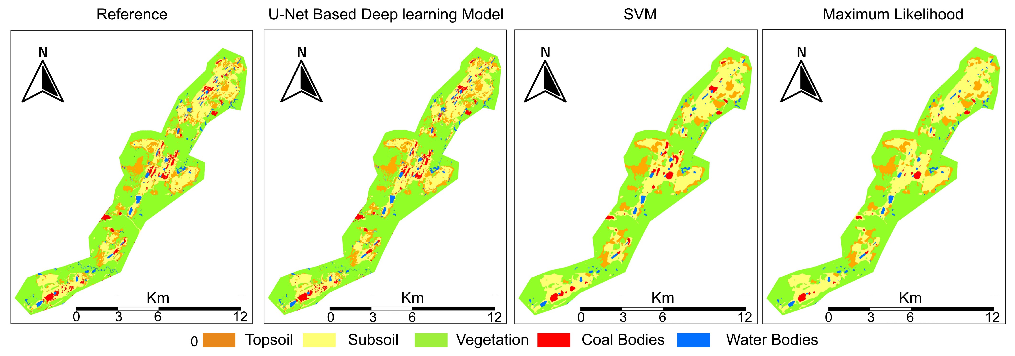 Coal-mining area classification: reference from adjusted topographic map by ministry of environment and forestry (reference), U-Net, SVM and Maximum Likelihood.