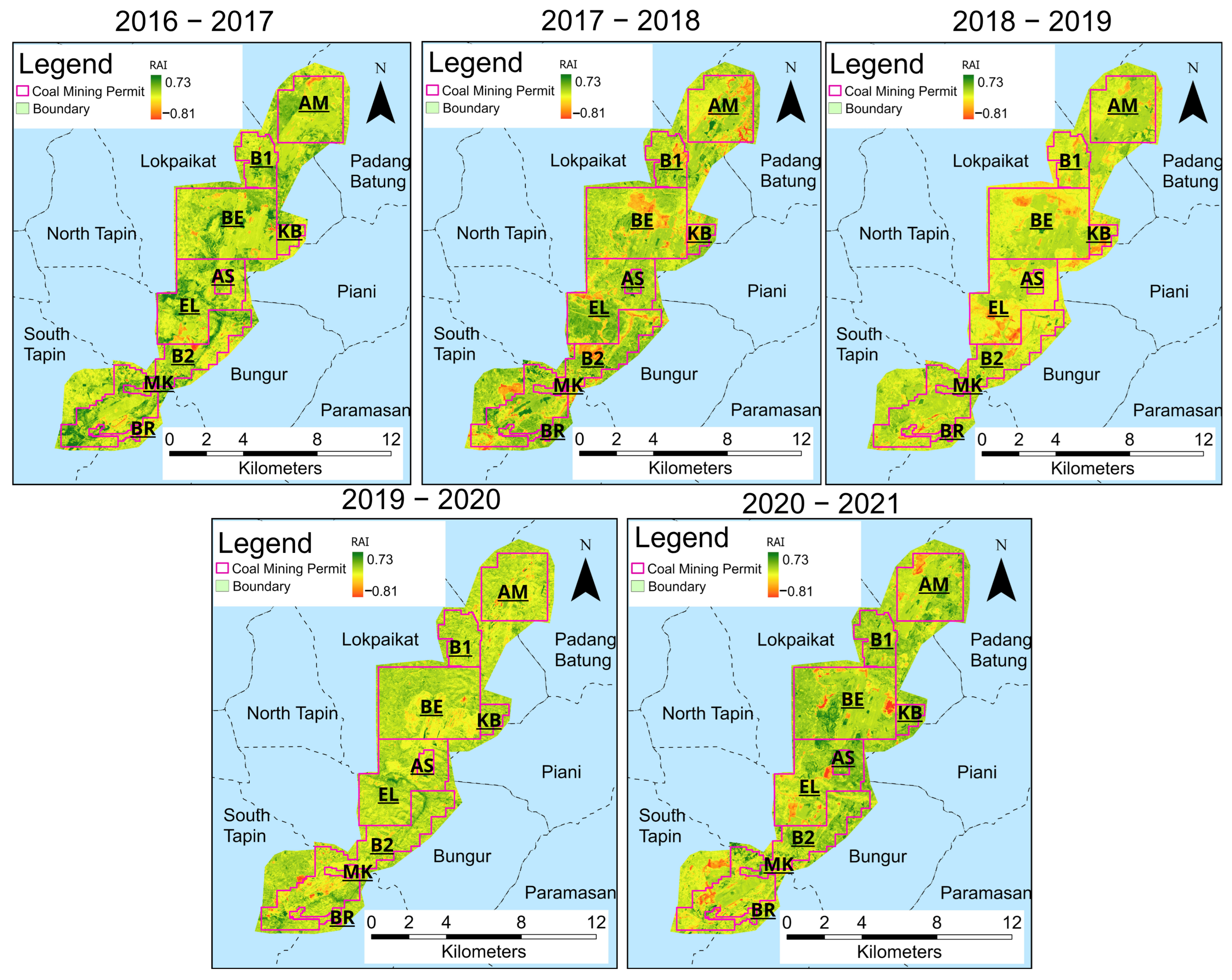 Multitemporal RAI with coal mining permit boundaries from the Minister of Energy and Mineral Resources. The labels (e.g., EL, B2, AM, KB) denote the mining permit holders, shown in abbreviated form consistent with the boundary dataset.