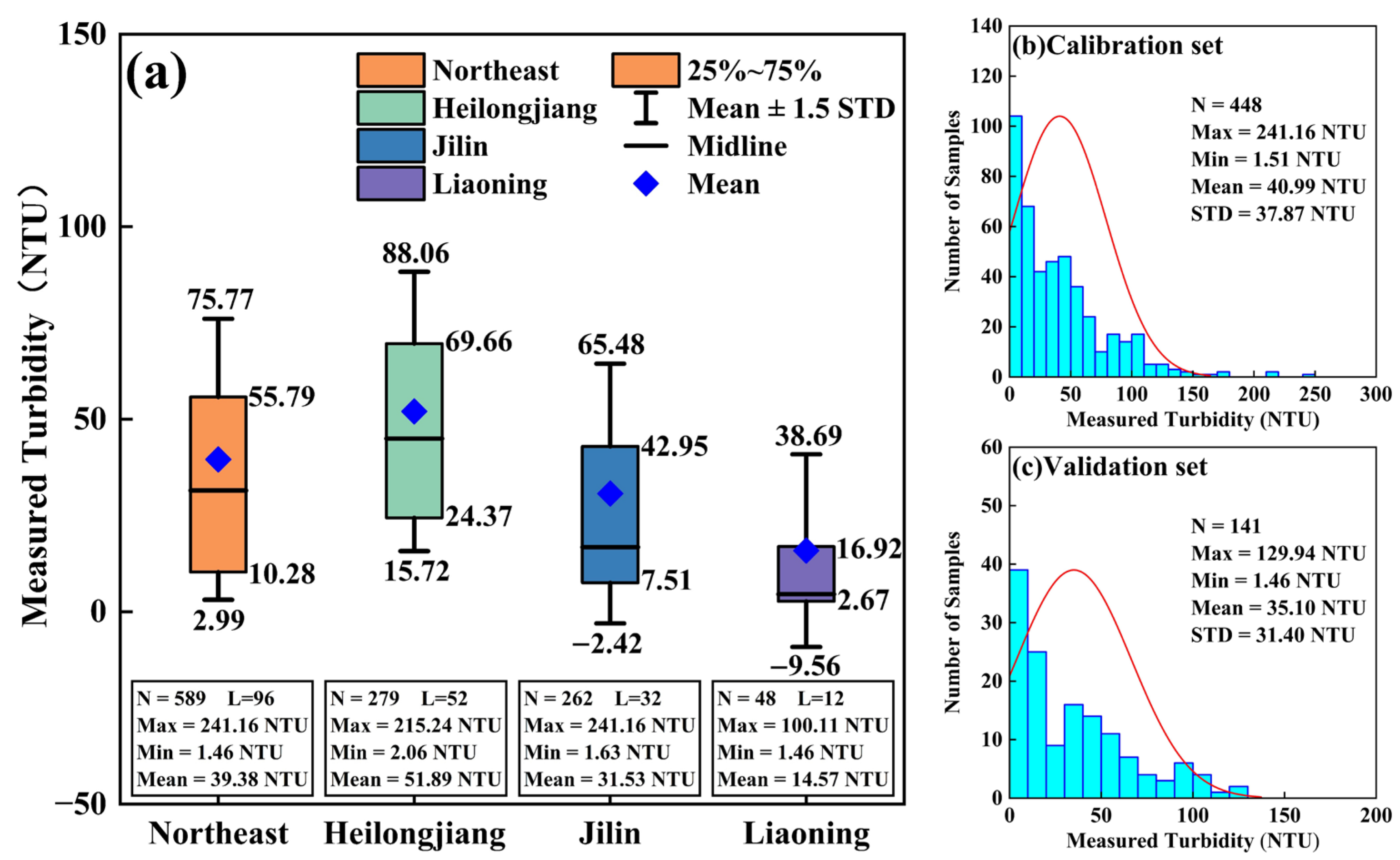 - Li, Y.; Li, S.J.; Song, K.S.; Liu, G.; Wen, Z.D.; Fang, C.; Shang, Y.X.; Lyu, L.L.; Zhang, L.L. Sentinel-3 OLCI observations of Chinese lake turbidity using machine learning algorithms. J. Hydrol. 2023, 622, 129668. [Google Scholar] [CrossRef]