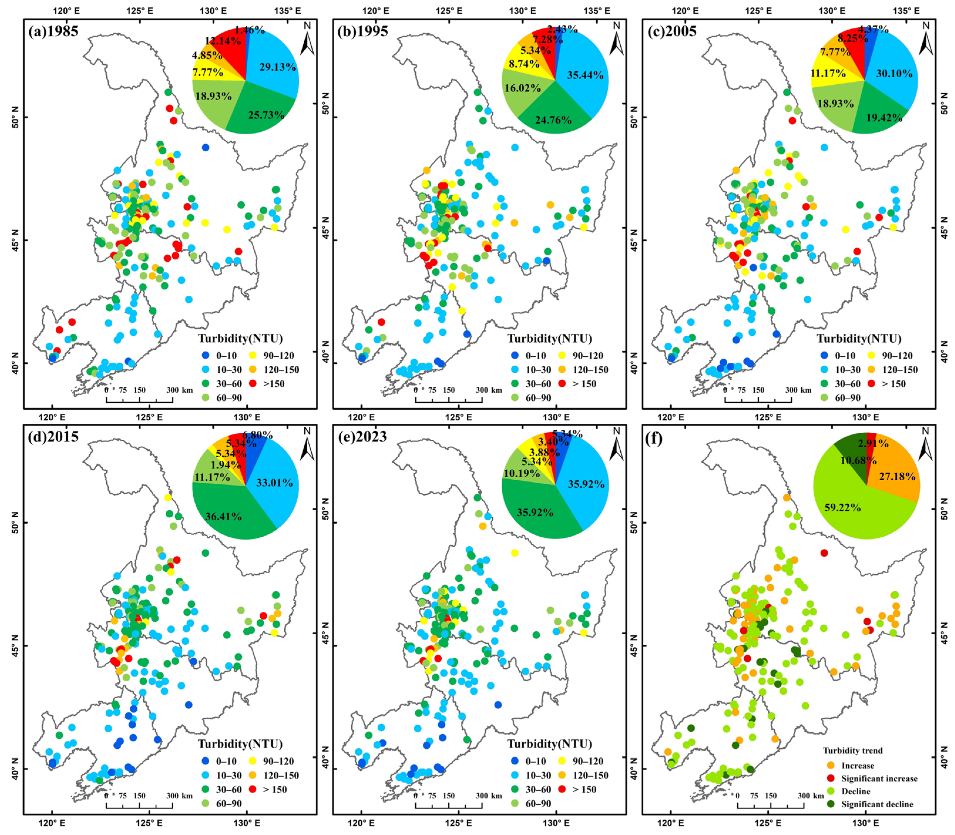 - The long-term spatiotemporal dynamics and driving factors of water turbidity were quantified based on Landsat data across Northeast China from 1985 to 2023.