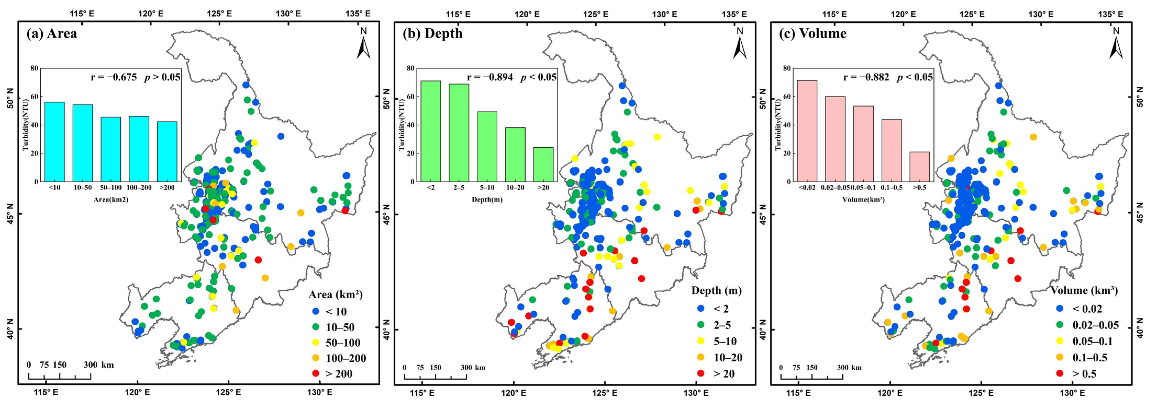 - Zhang, L.; Xin, Z.H.; Feng, L.; Hu, C.M.; Zhou, H.C.; Wang, Y.; Song, C.C.; Zhang, C. Turbidity dynamics of large lakes and reservoirs in northeastern China in response to natural factors and human activities. J. Clean. Prod. 2022, 368, 133148. [Google Scholar] [CrossRef]