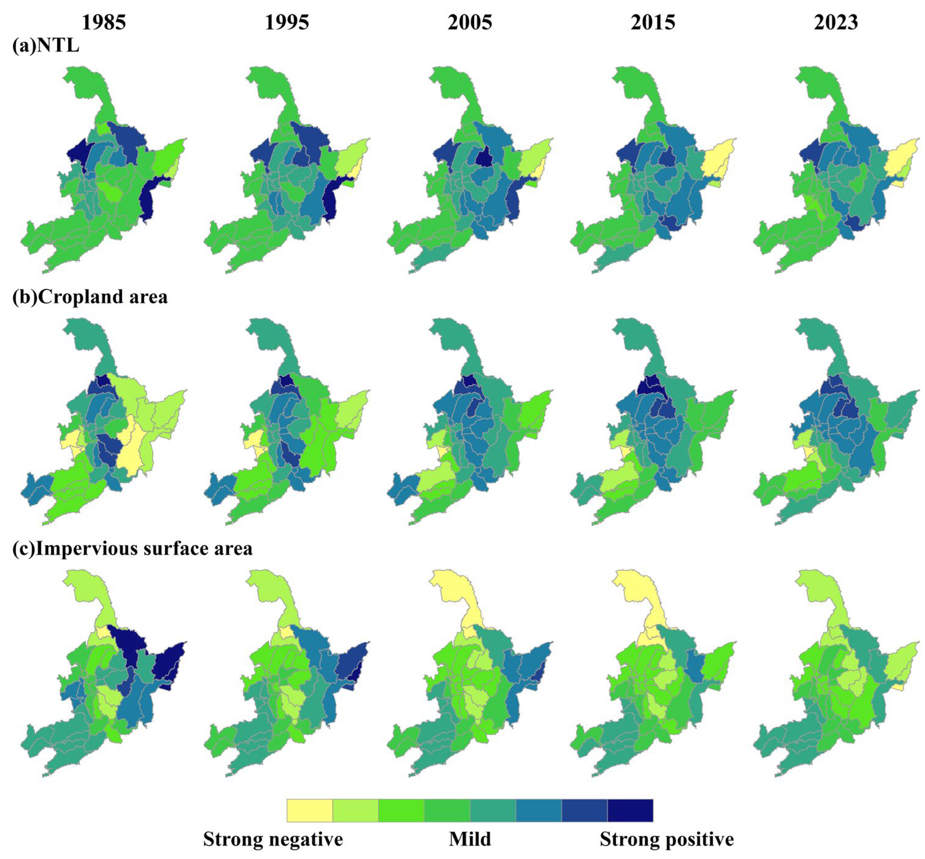 | Moran’s I index | 0.108 | 0.105 | 0.148 | 0.203 | 0.183 |