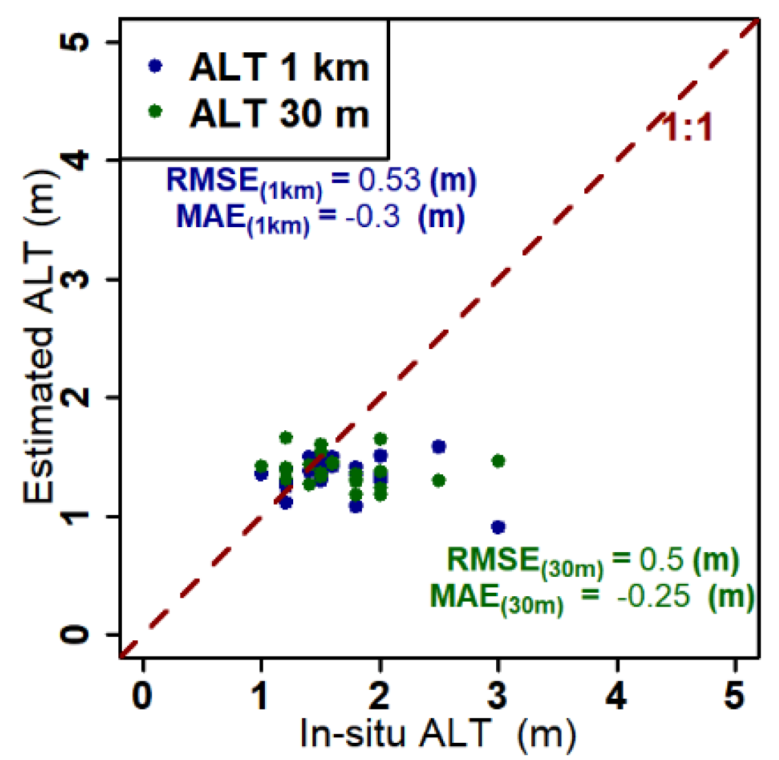 3.4. Comparison of the ALT Estimated from MODIS LST and the Downscaled LST