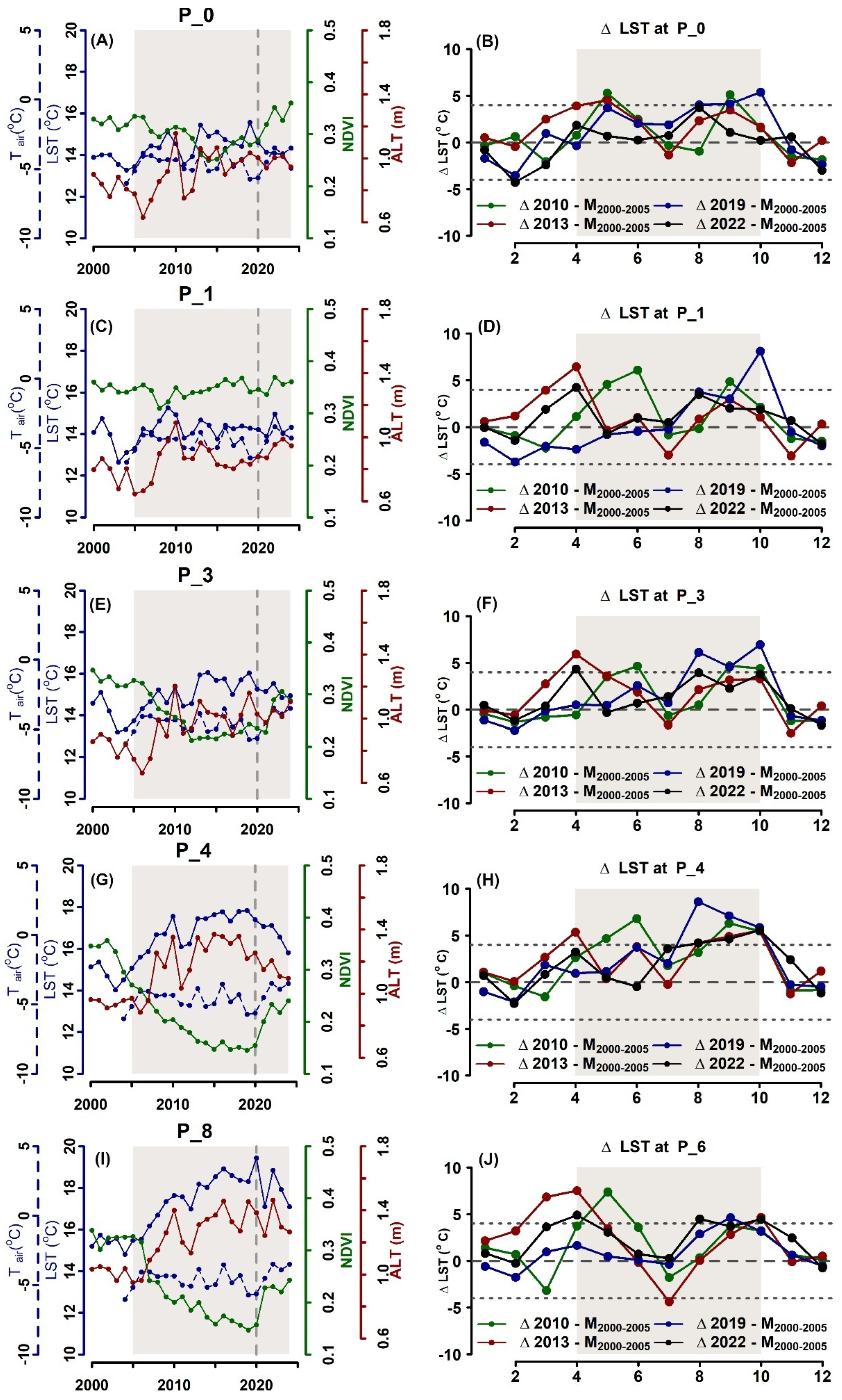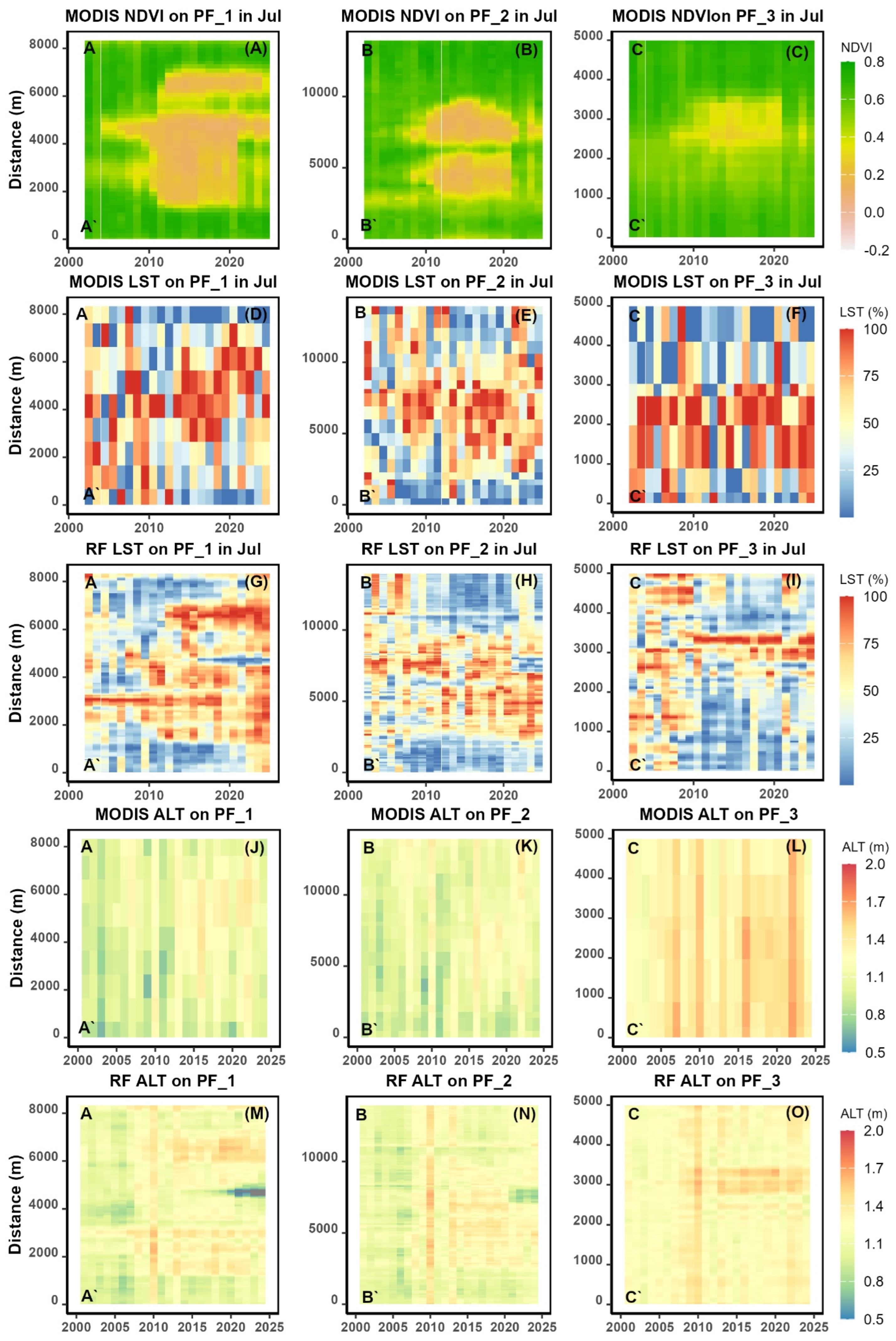 3.4.2. Temporal Changes in NDVI, LST and ALT Along Typical Profiles