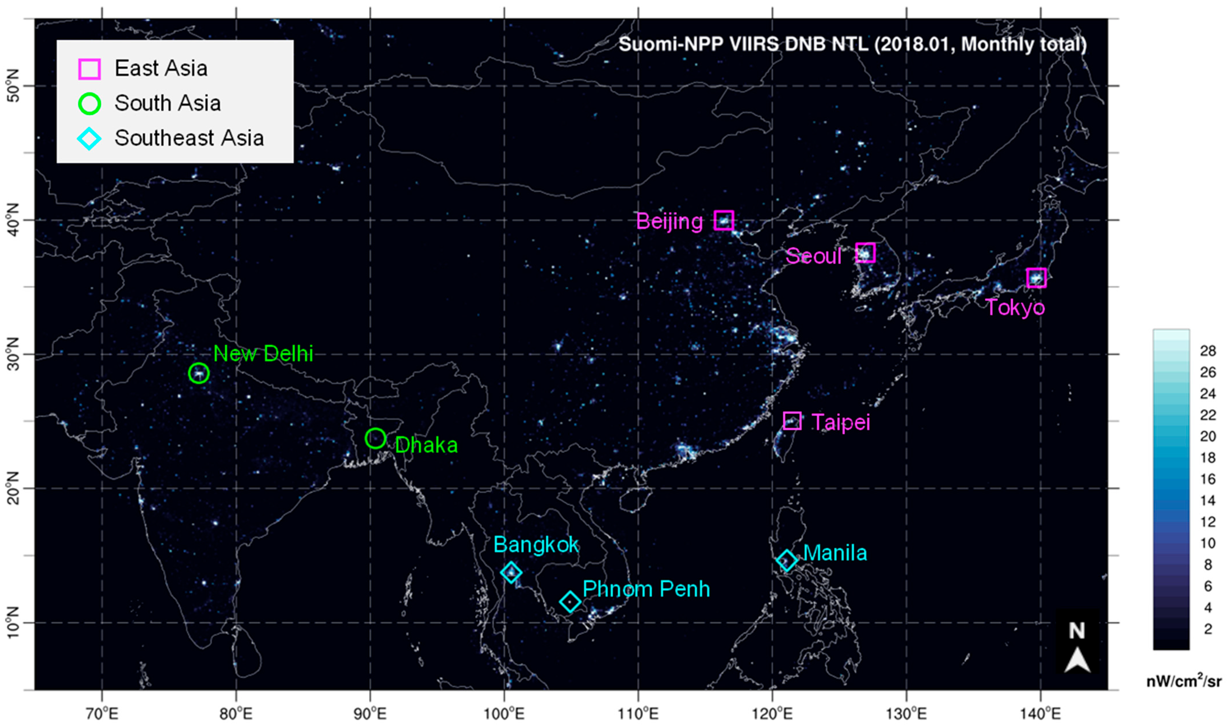 2/sr. These data are provided in a tiled format. For the analysis of the Asian region, which is the focus of this study, we used the Tile3 (60E75N) data from the VIIRS/DNB sensor data record (SVDNB).