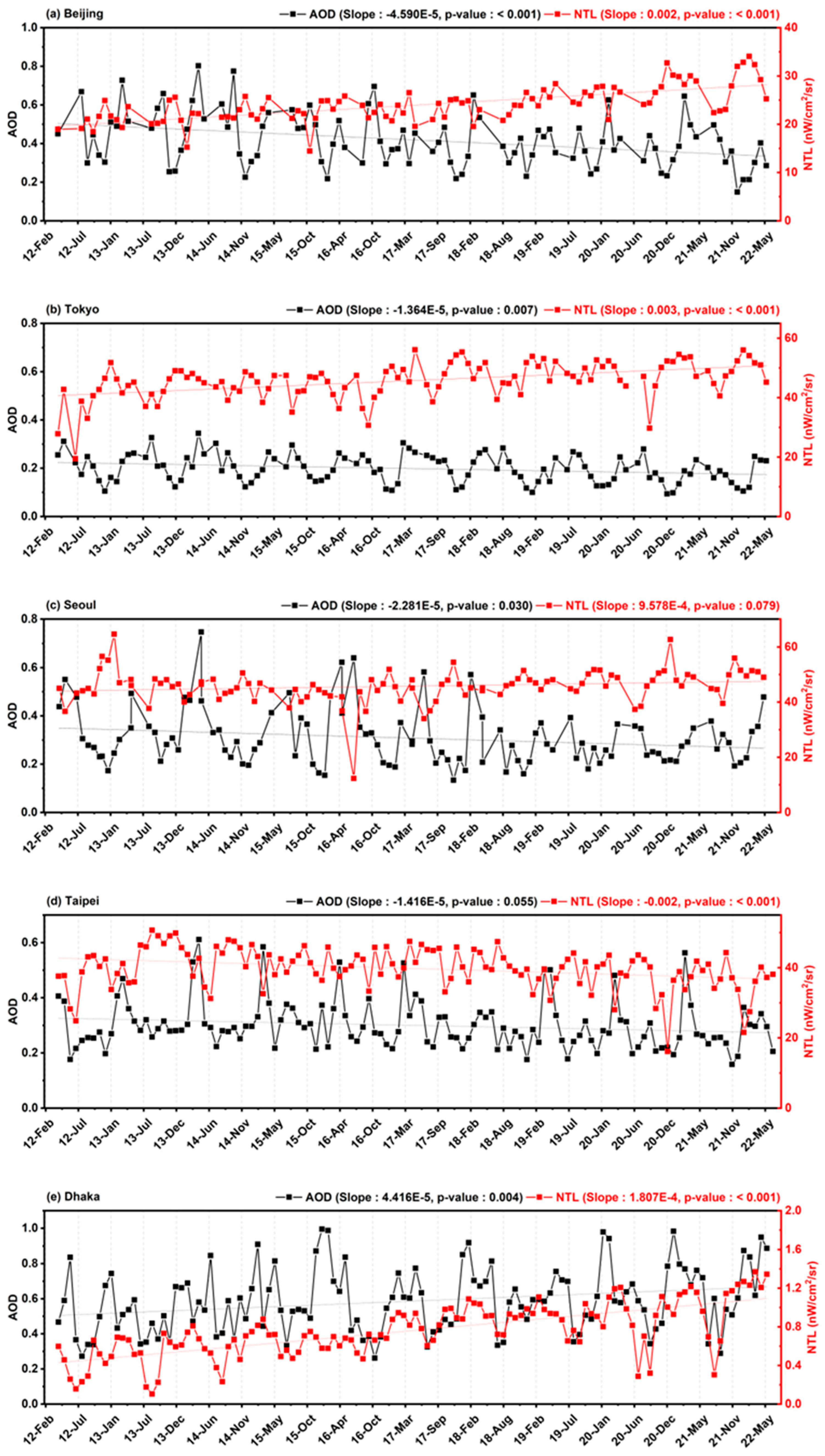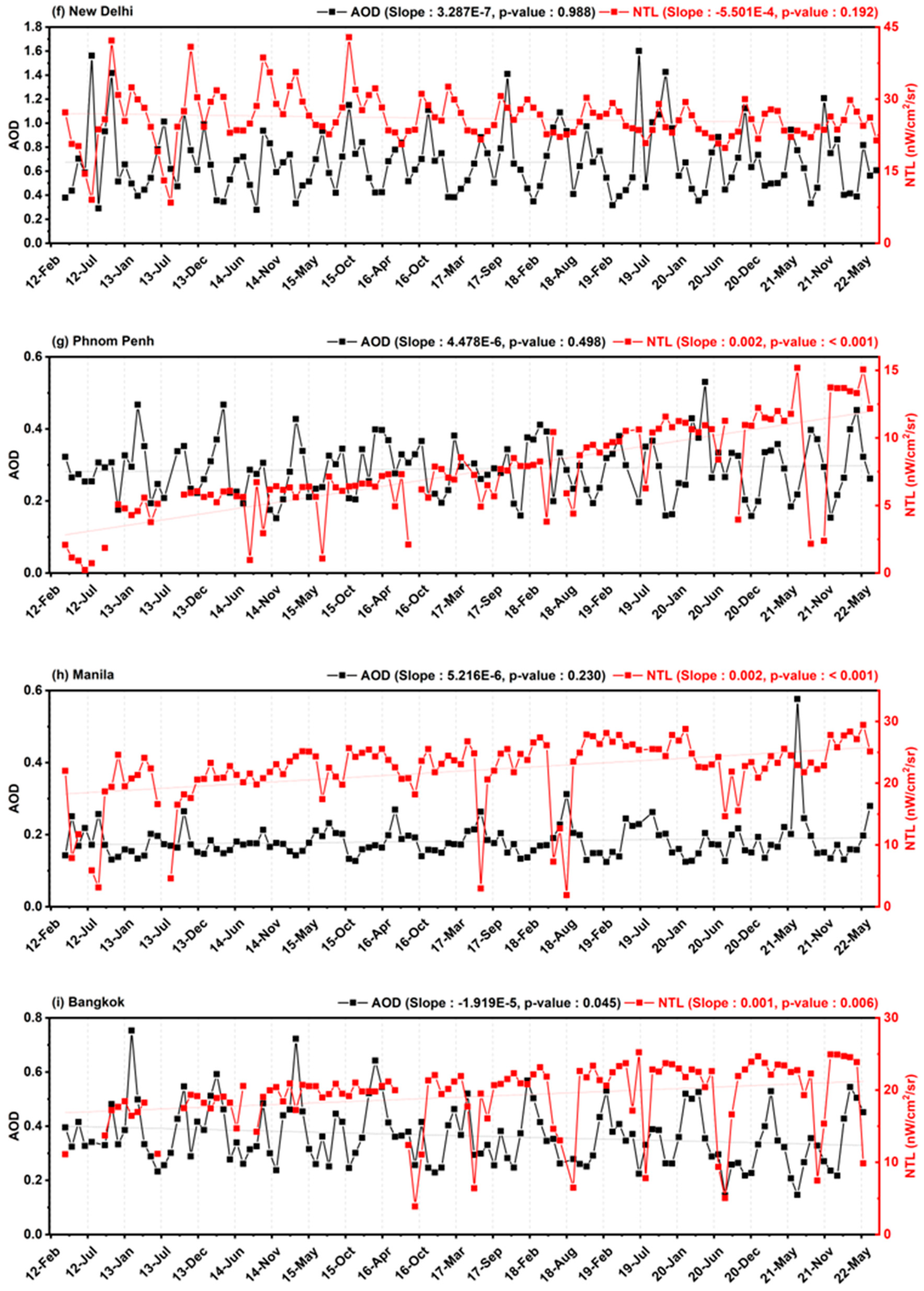 In the South Asian region, Dhaka uniquely displayed increasing trends in both AOD and NTL radiance, resulting in a positive correlation between the two factors. Regarding New Delhi, a notable observation was the reduction in the amplitude of NTL radiance’s annual oscillation after 2016. Across the Southeast Asian cities of Phnom Penh, Manila, and Bangkok, an increasing NTL radiance trend was found. In contrast, AOD in these Southeast Asian cities either remained relatively stable or, in the case of Bangkok, even exhibited a decreasing pattern.