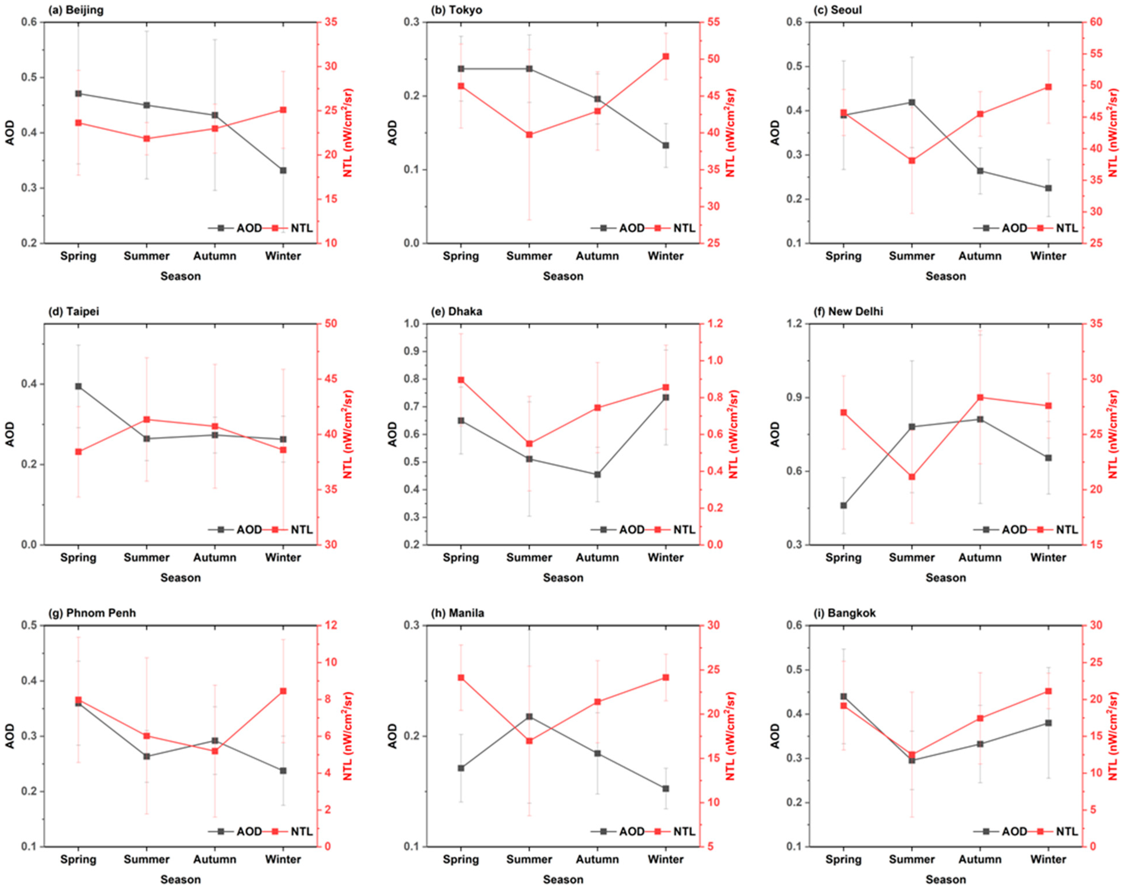 Figure 3, the predominant pattern in NTL radiance is an annual oscillation, featuring higher average radiance during the winter months (December, January, and February) and a decreasing tendency during the summer months (June, July, and August). This seasonal variation was clearly observed in Seoul, Tokyo, Beijing, Bangkok, Manila, and Phnom Penh, with the exception of Taipei. In South Asia, the lowest NTL radiance during summer was consistent; however, Dhaka experienced its highest NTL radiance in spring (March, April, and May), whereas New Delhi’s peak occurred in fall (September, October, and November).