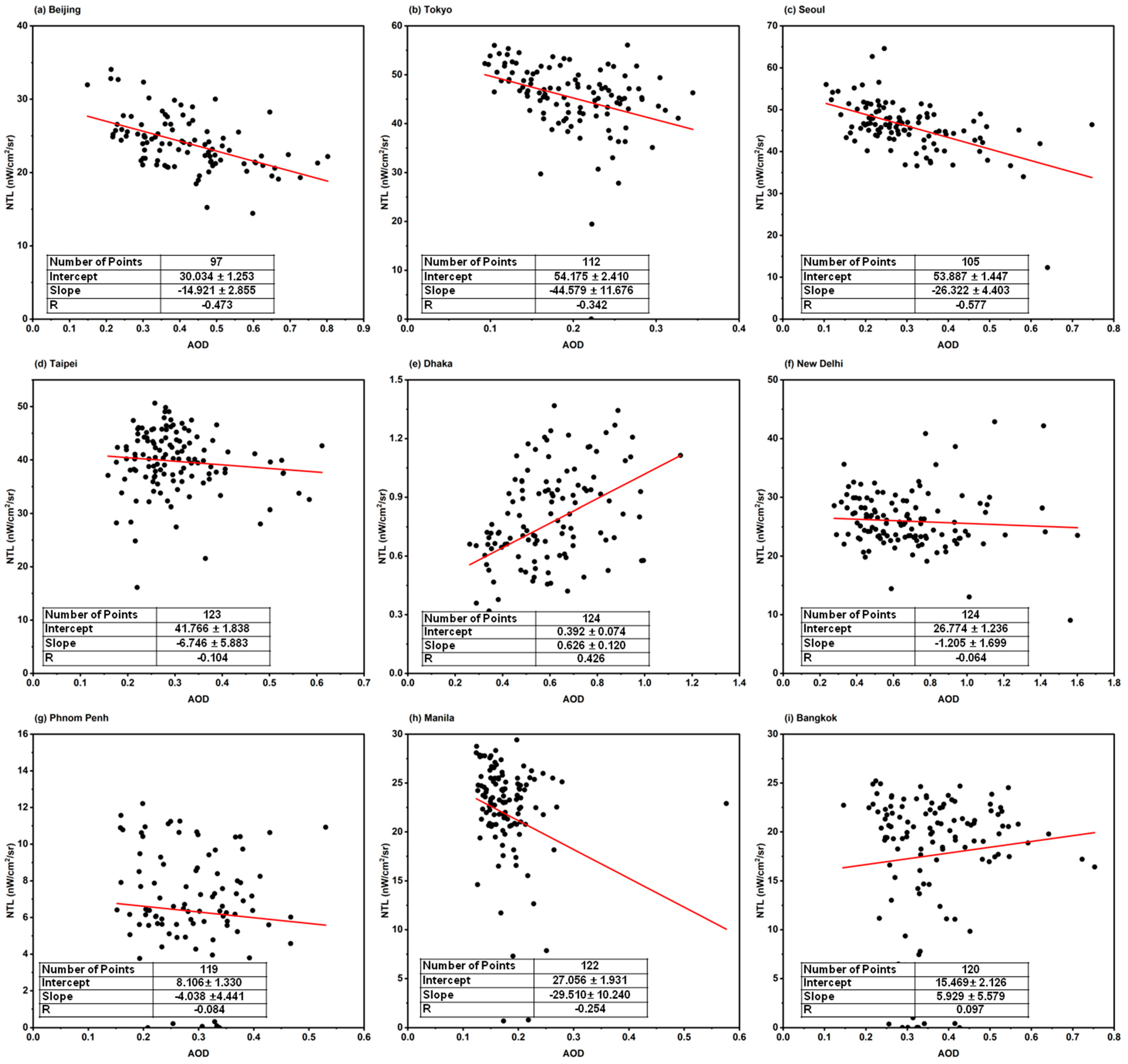 While the linear regression model for Manila in Southeast Asia also showed a notable negative slope of approximately −29.51, the observed dependency of NTL radiance on AOD in this region requires cautious interpretation due to a low R of −0.254, when contrasted with major East Asian cities.