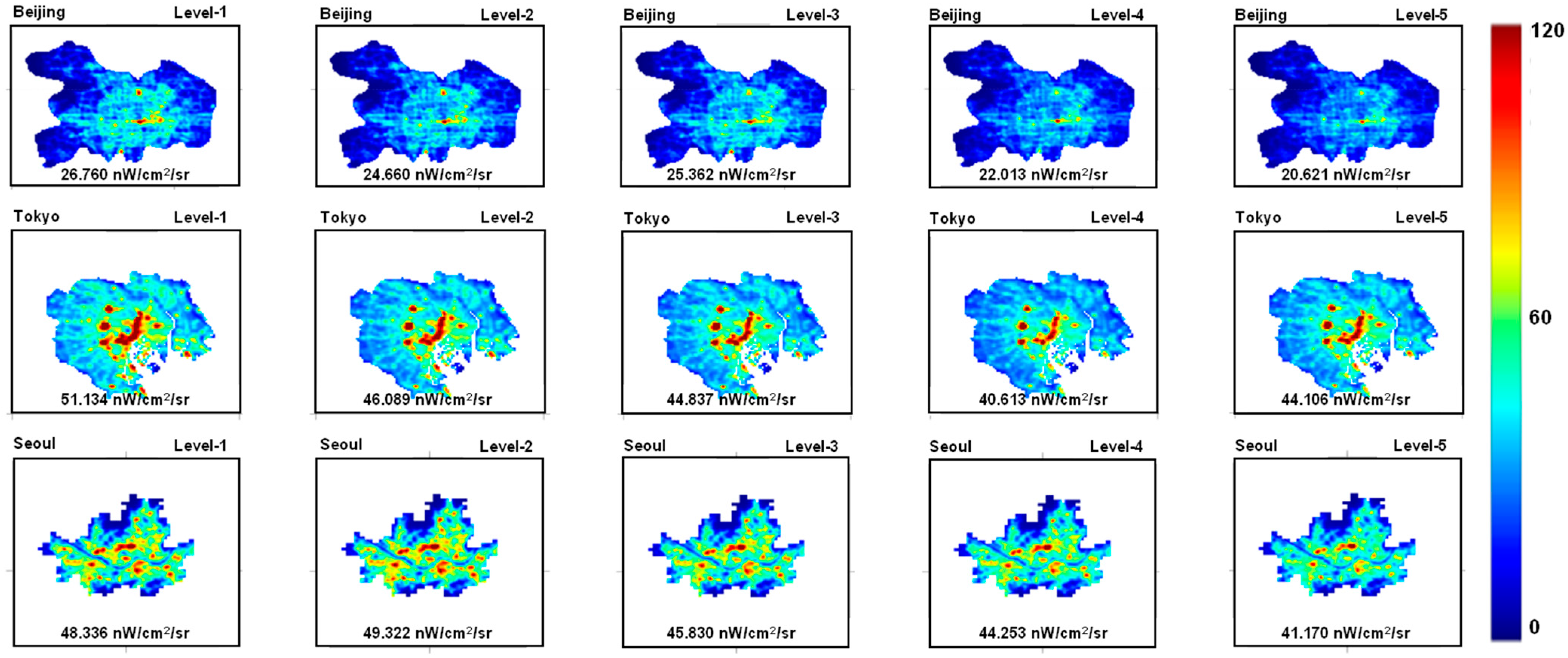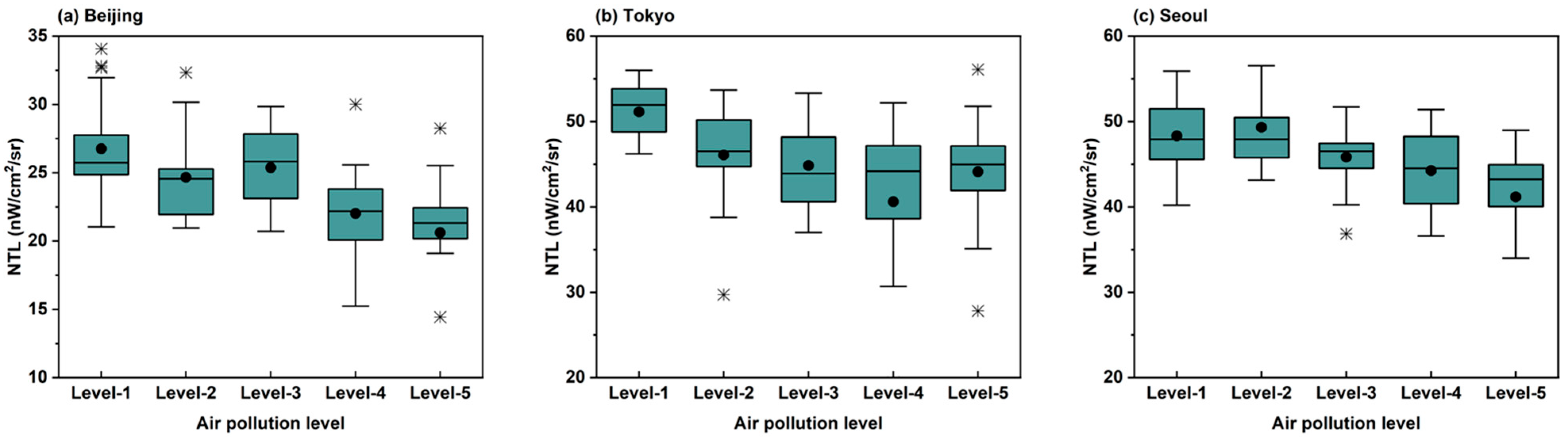 Beijing consistently exhibited higher average AOD levels compared to Seoul or Tokyo. For Level-1 (relatively good air quality), the average AOD was 0.25, increasing to 0.33 (Level-2), 0.40 (Level-3), 0.48 (Level-4), and 0.62 (Level-5). Correspondingly, the average NTL radiance at Level-1, which was 26.76 nW/cm2/sr, gradually decreased across AOD levels to 24.66, 25.36, 22.01, and 20.62 nW/cm2/sr.