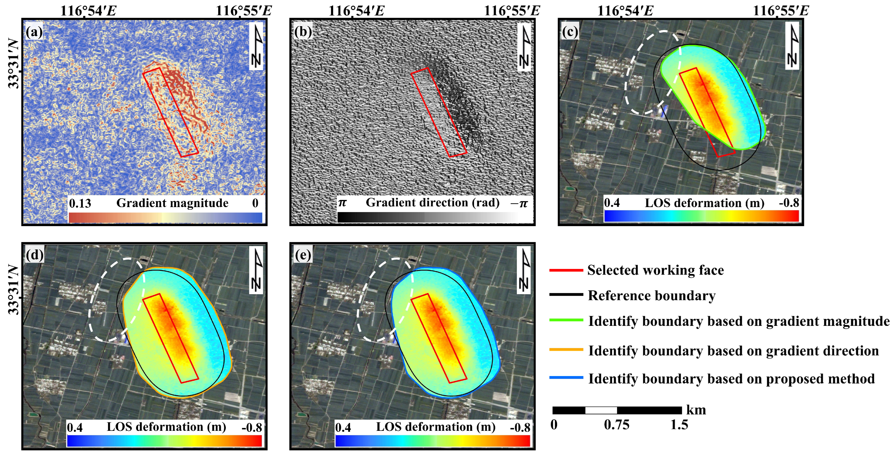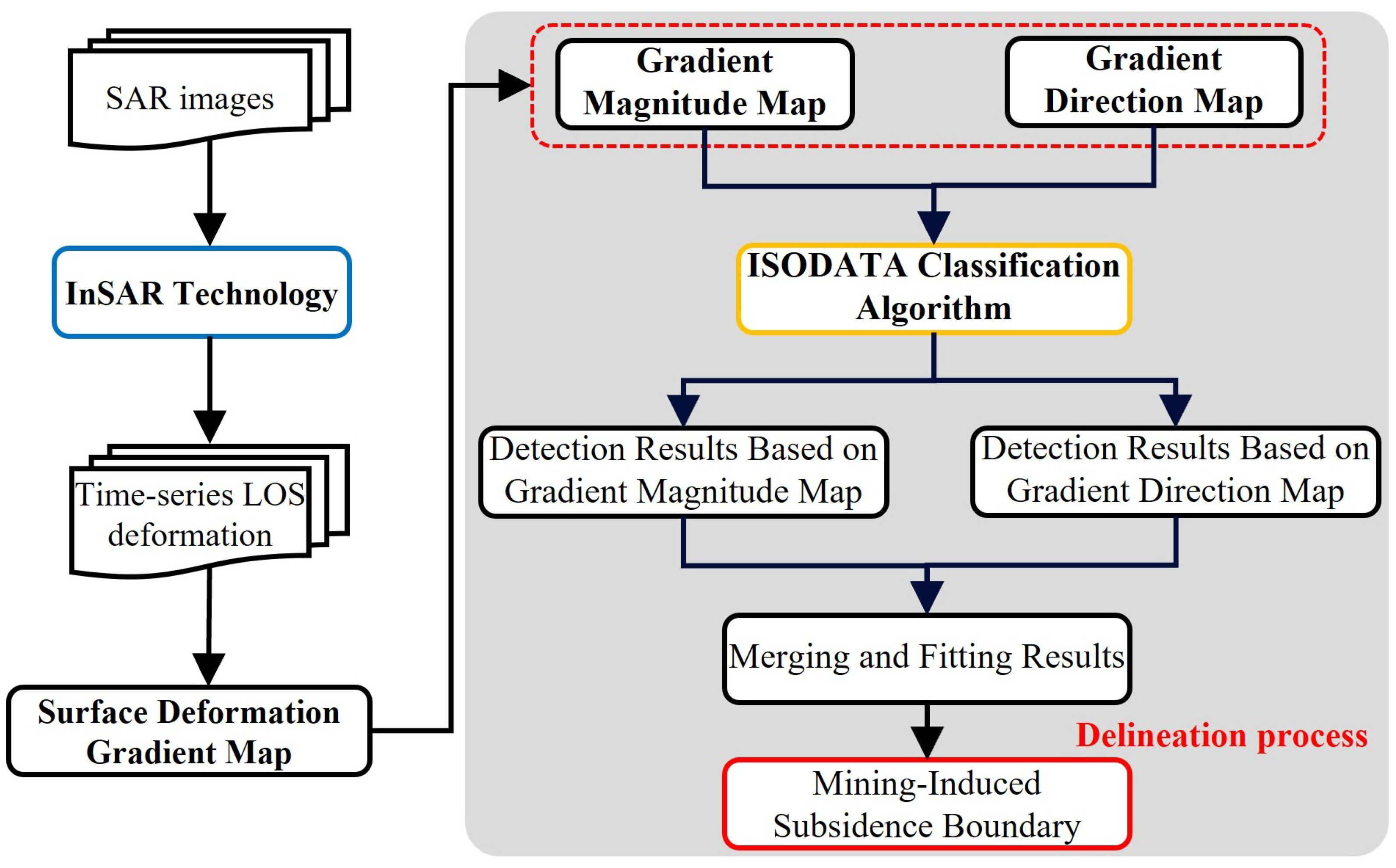 - Applying the ISODATA clustering algorithm by integrating both the gradient magnitude and direction of the deformation gradient to accurately delineate the mining-induced subsidence boundary (Section 2.3).