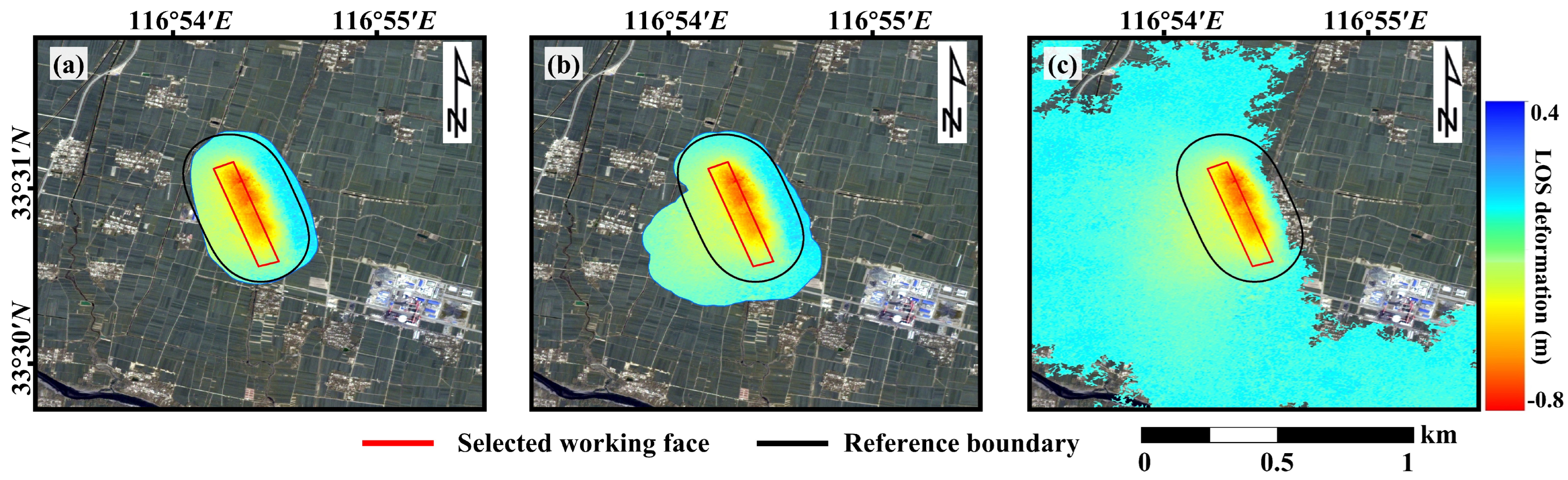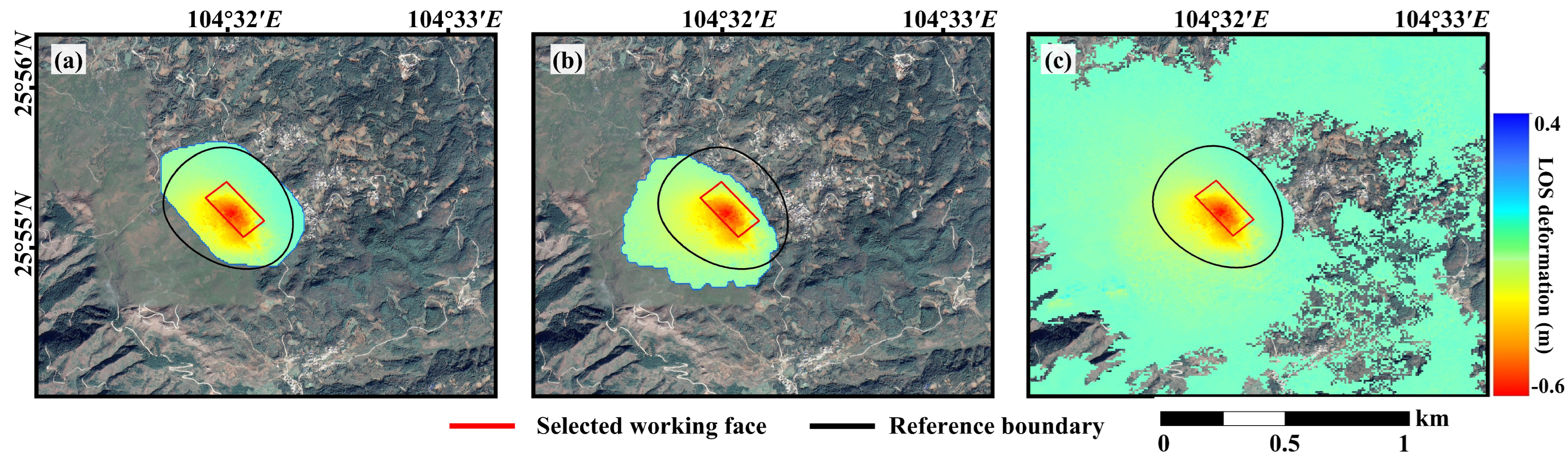 - Through simulation experiments, the proposed DMSB-DG method demonstrated the ability to delineate mining-induced subsidence boundaries with high precision using single-track data (either ascending or descending). It should be noted that integrating both ascending and descending LOS measurements can further improve delineation accuracy. Furthermore, when the deformation observation errors are relatively small (with a noise standard deviation below 0.07 m), the proposed method maintains high accuracy in identifying mining-induced subsidence boundaries, indicating strong robustness. However, as observation errors increase, the accuracy of the delineation decreases significantly. Therefore, it is important to obtain high-precision deformation measurements to accurately delineate mining-induced subsidence boundaries.
