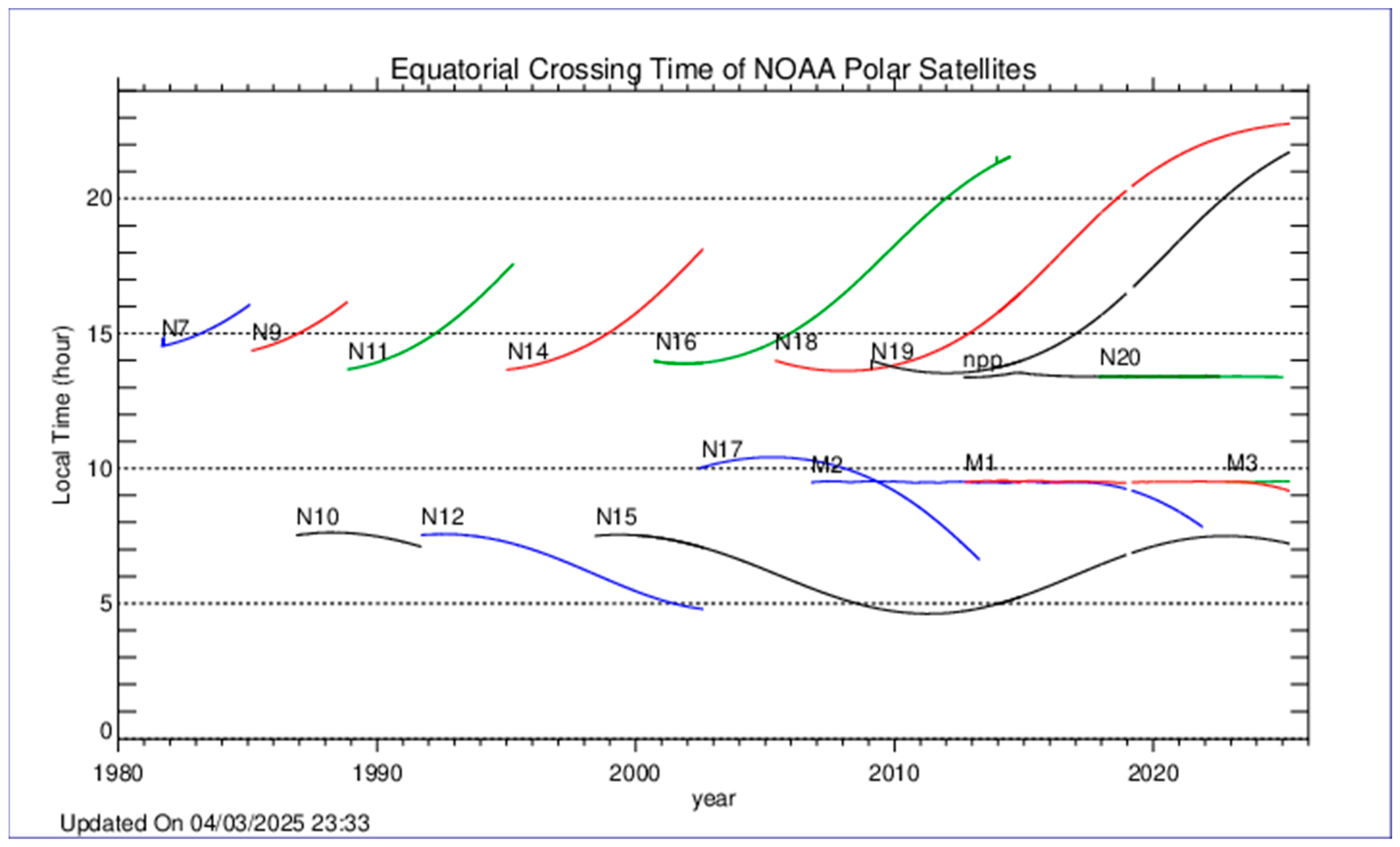AVHRR/VIIRS | TIROS-N | NOAA-6, 8, 10 | NOAA-7, 9, 11, 12, 14 | NOAA-15 and Onward | Suomi NPP, NOAA-20, NOAA-21 | GAC/VGAC Nadir Resolution (km) |