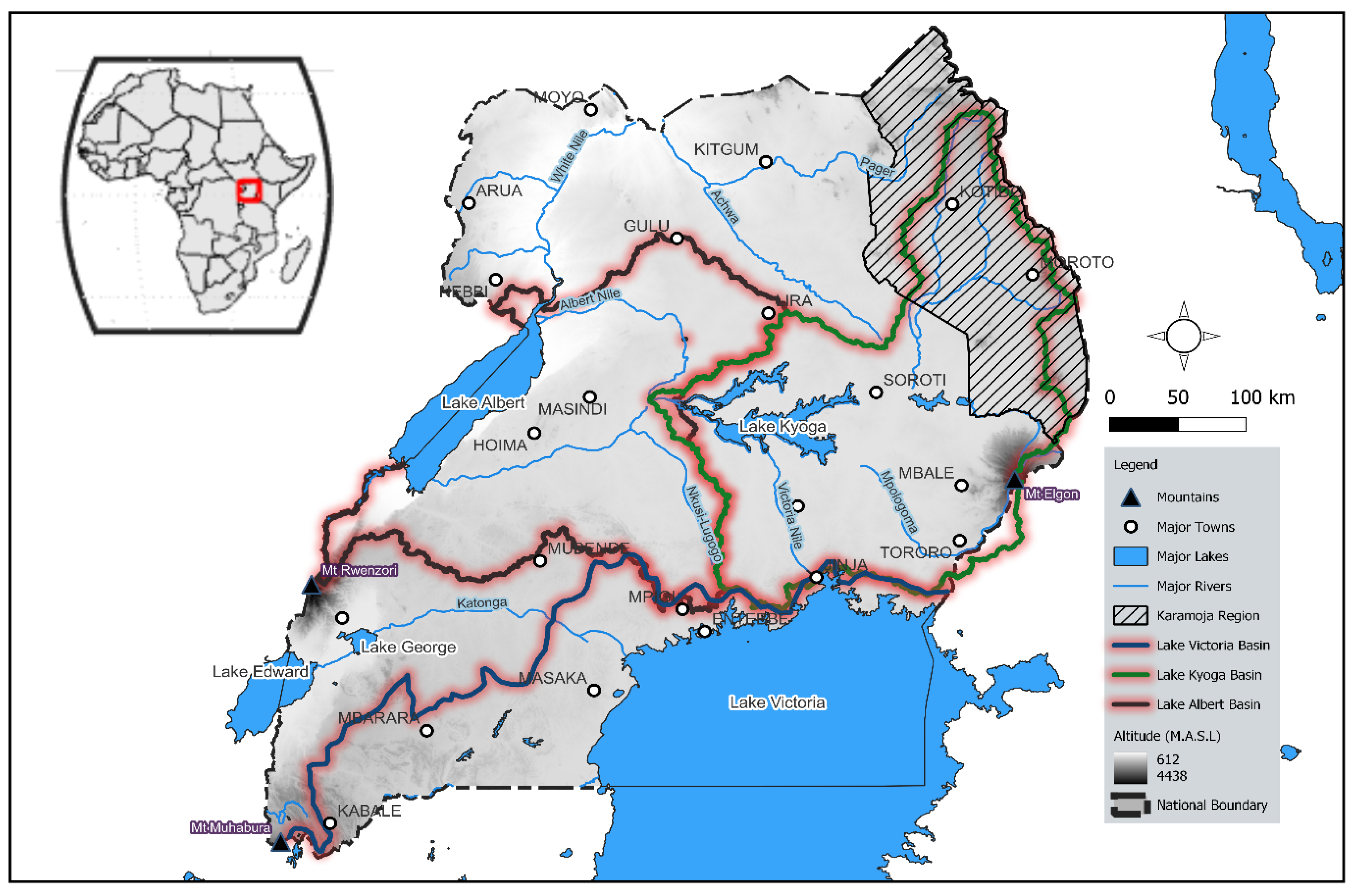 - Nsubuga, F.W.; Rautenbach, H. Climate change and variability: A review of what is known and ought to be known for Uganda. Int. J. Clim. Change Strateg. Manag. 2018, 10, 752–771. [Google Scholar] [CrossRef]