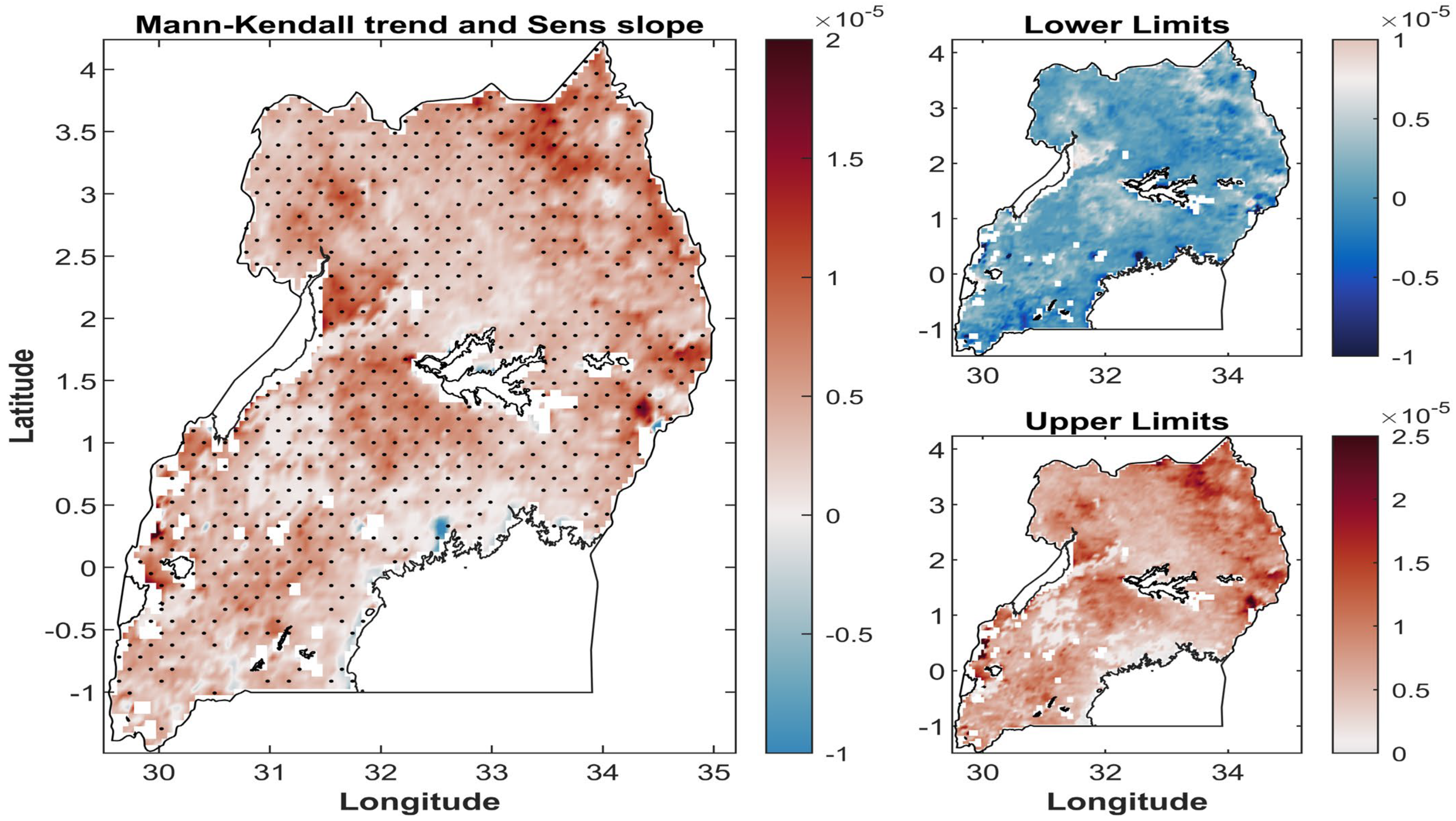 - Magara, G.; Okrah, A.; Yao, Y.I.S.; Yeboah, E.; Darko, G.; Akimana, D.; Awuku, V.; Quist, I.; Sarfo, I. A Quantitative Assessment of Drought Trends in Uganda Using Statistical Models for Hydrological Indicators. Int. J. Environ. Clim. Change 2025, 15, 517–537. [Google Scholar] [CrossRef]