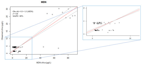 Pahlevan et al. [55] developed MDN to estimate Chl-a and compared it to other available algorithms. They reported that MDN performed better, resulting in a MAPE of 24.0, using Sentinel-2. We also found that MDN performed the best of all the algorithms we compared, resulting in an r2 of 0.80; however, our analysis resulted in an MAPE of 80.