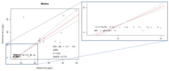 Scatterplot comparing observed chlorophyll-a and results from Mishra [57] algorithm with the CV threshold at 0.4 (40) and the corresponding statistical results.