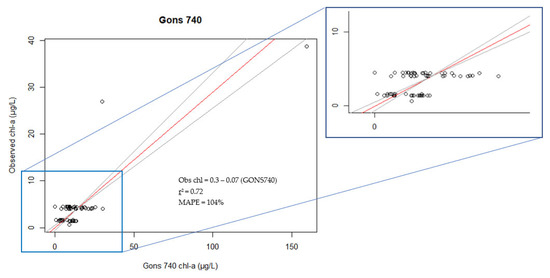 Scatterplot comparing observed chlorophyll-a and results from Gons 740 [19] algorithm with the CV threshold at 0.4 (40%) and the corresponding statistical results.