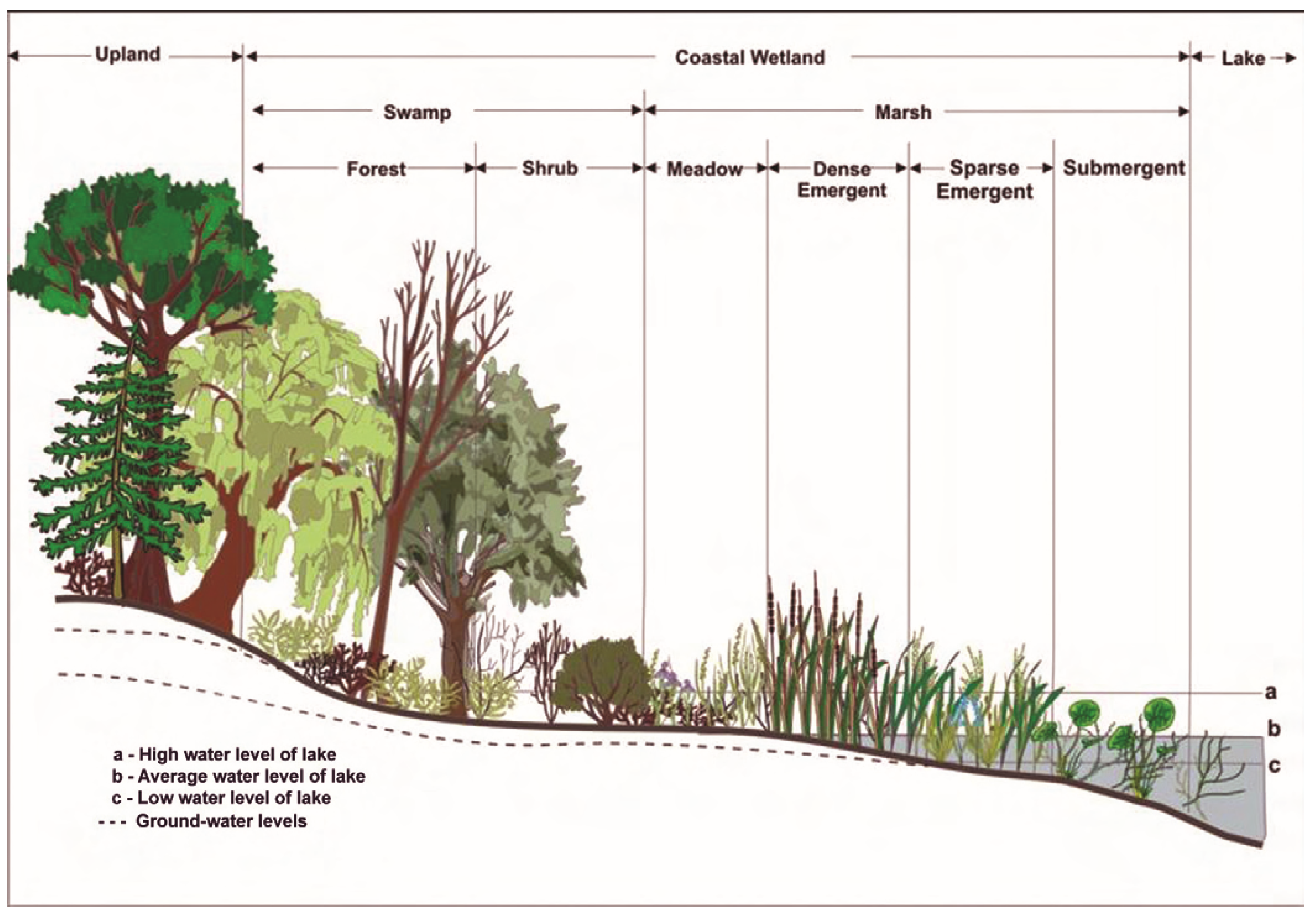 Figure 2). Not all zones are present or well-developed in every coastal wetland complex, as variation is contingent on site-specific conditions. These coastal wetlands represent a diverse set of ecosystems ranging from marshes, freshwater estuaries, deltas, lagoons and lake plain prairie to fens, bogs, shrub or treed swamps [