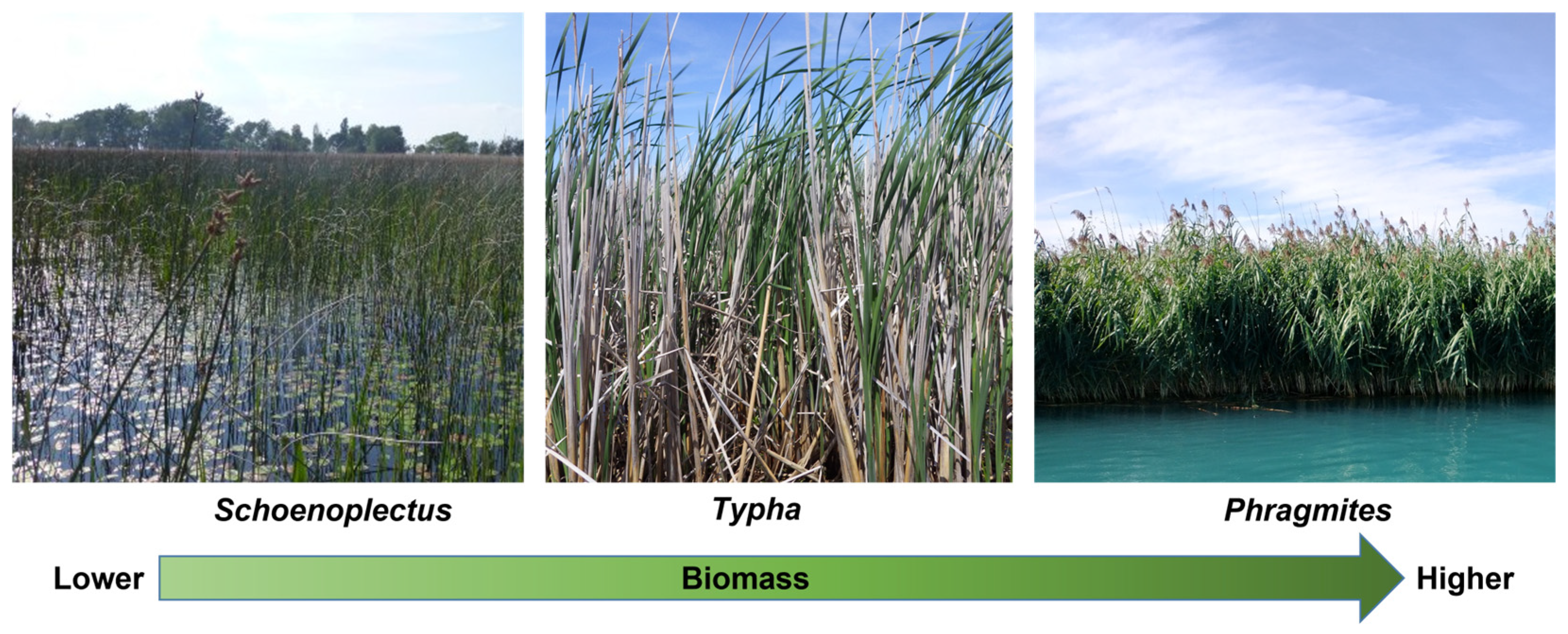For biomass estimation, unpublished allometric equations were used from the University of Michigan’s database for Schoenoplectus and Typha. For Phragmites, no equations existed, so we harvested Phragmites stems from 2 locations (20 stems) and developed a new biomass equation based on height of vegetation.