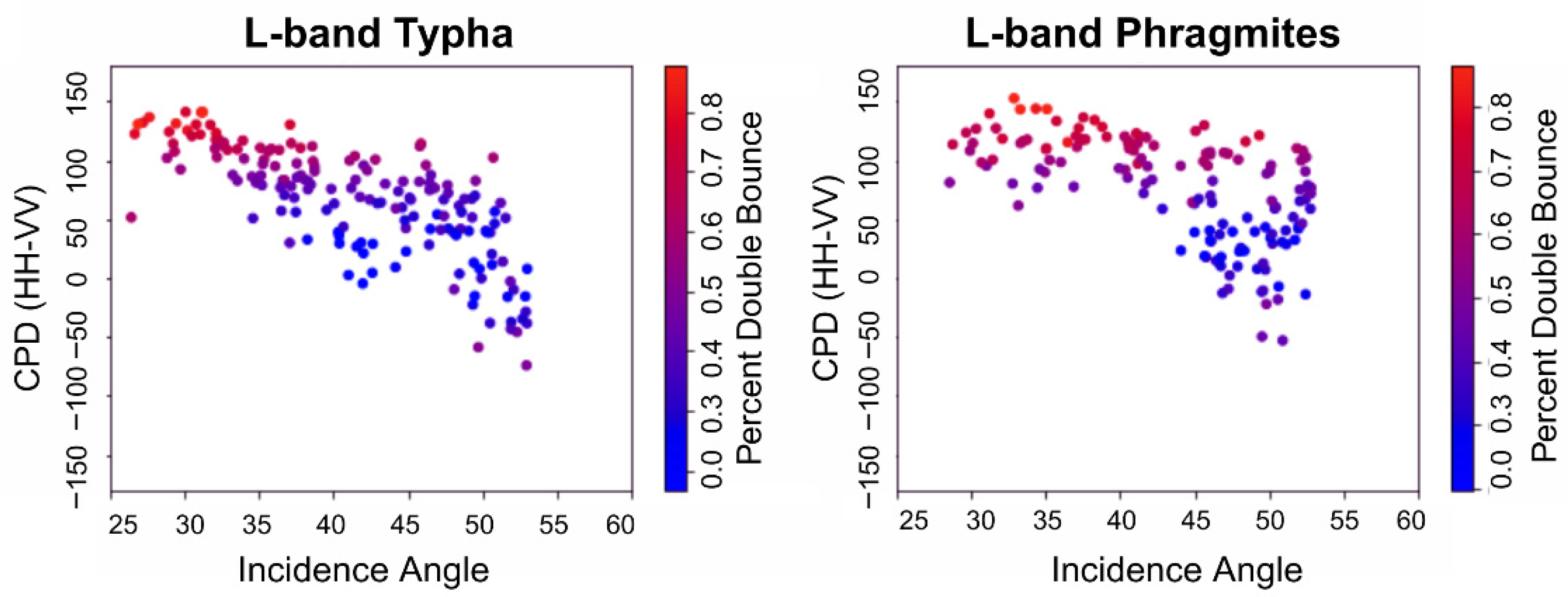 Phragmites (mean 1083 to 2667 g/sq m) and volume scatter dominated for C- and S-bands, with limited detections of inundation. Only the L-band showed dominance of double-bounce scatter in the three-component decomposition and allowed for more reliable inundation detection. For all of these genera, there are incidence angle limitations, and incidence angles shallower than 35° have higher uncertainty in inundation detection capability.