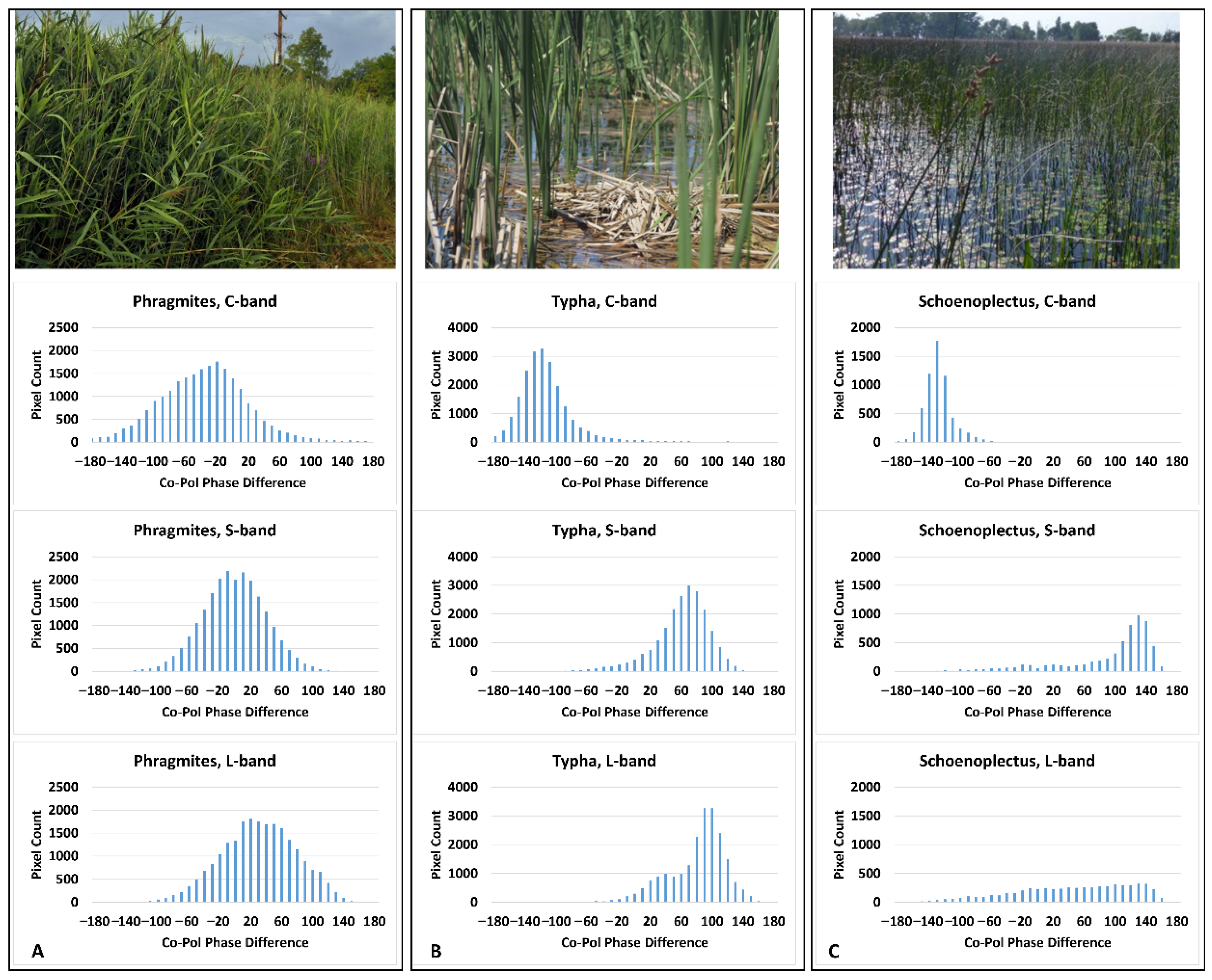 We created co-pol phase difference histograms of the three dominant wetland monocultures, using 2019 multi-date Radarsat-2 and Worldview basemaps [
